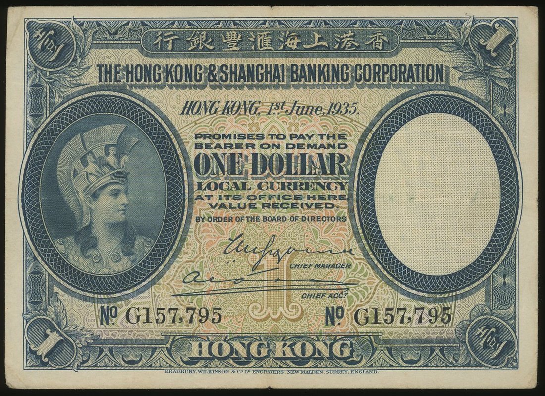 The Hongkong and Shanghai Banking Corporation, $1, 1.6.1935, serial number G157795, (Pick 172c), about very fine, cross fold with pinholes