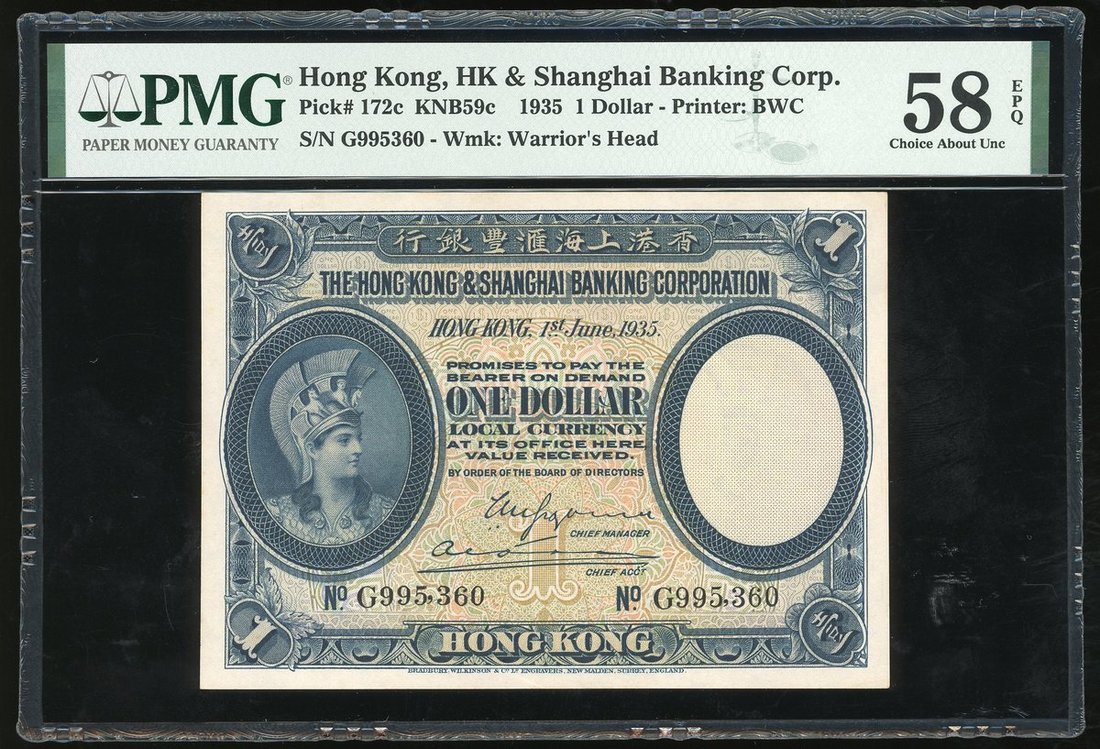 The HongKong and Shanghai Banking Corporation, $1, 1.6.1935, serial number G995360, (Pick 172c), PMG 58EPQ Choice About Uncirculated