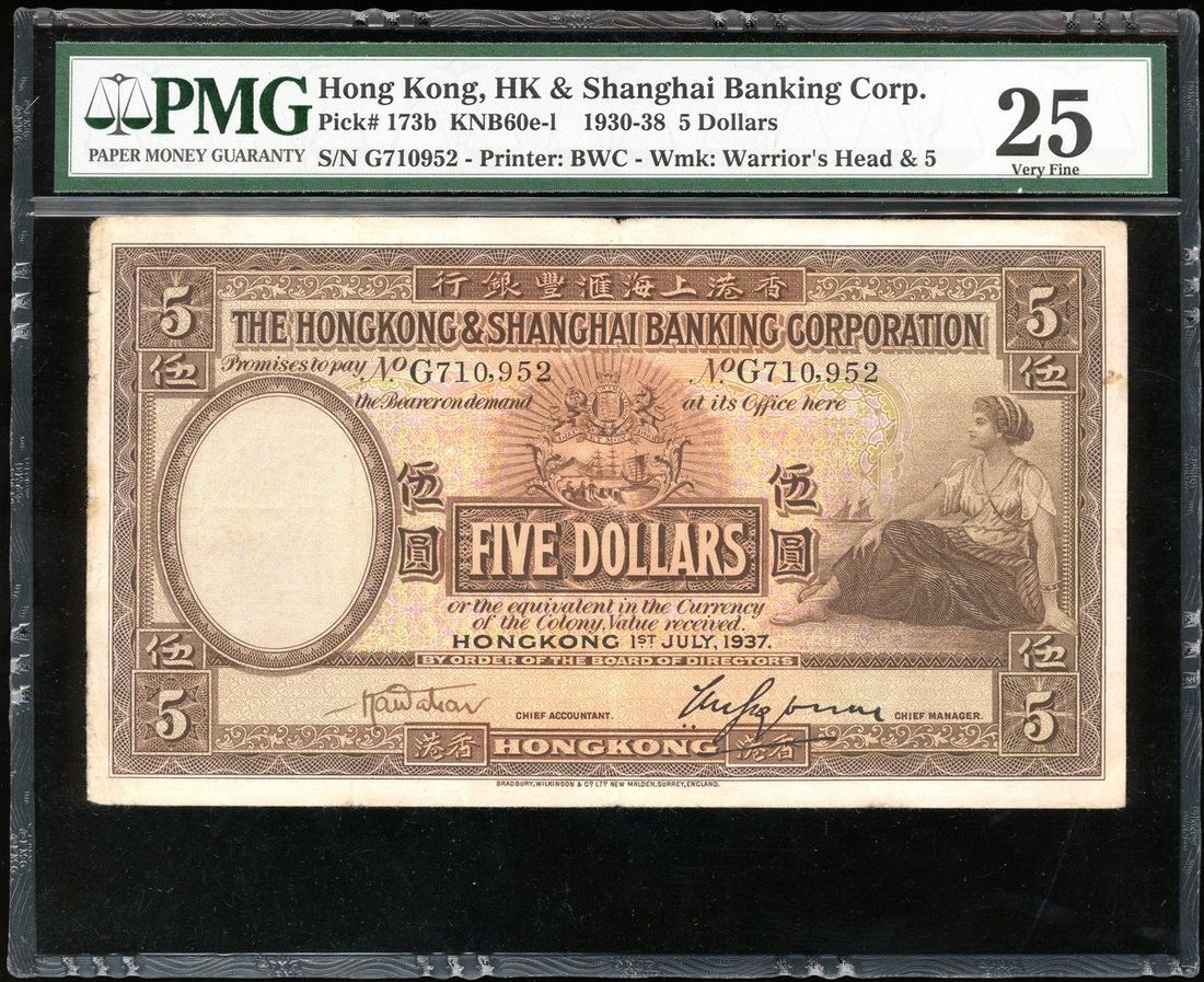 The HongKong and Shanghai Banking Corporation, $5, 1.7.1937, serial number G710952, handsigned at lower left,