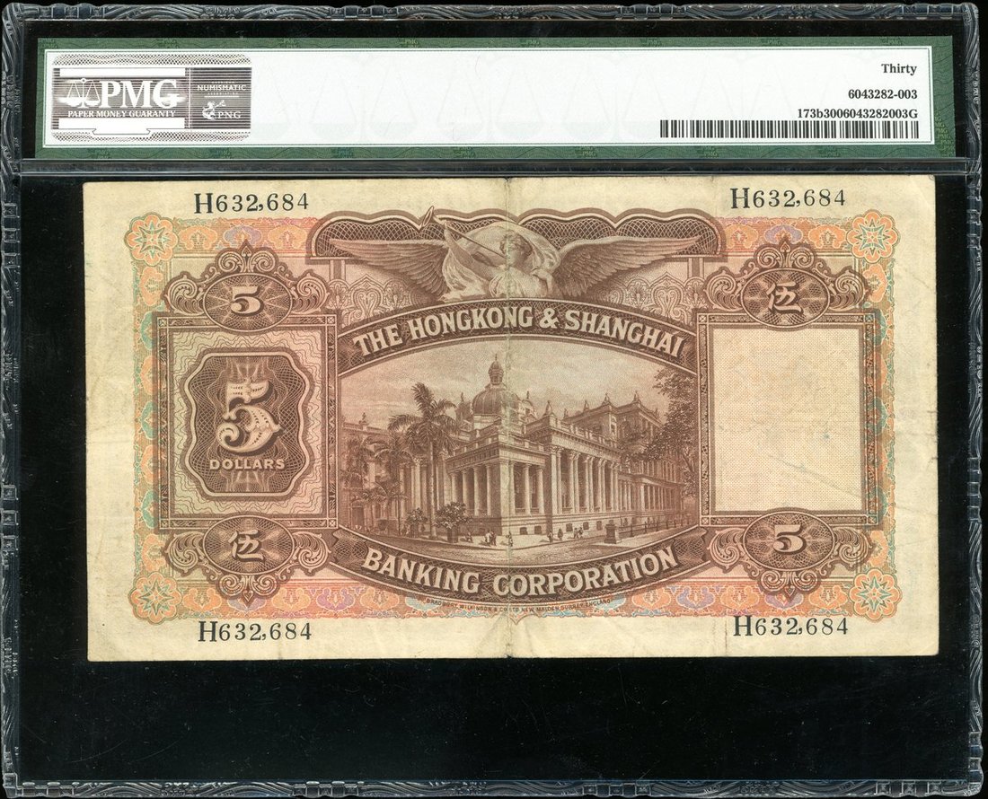1938年匯豐銀行5元,編號H632684,PMG 30