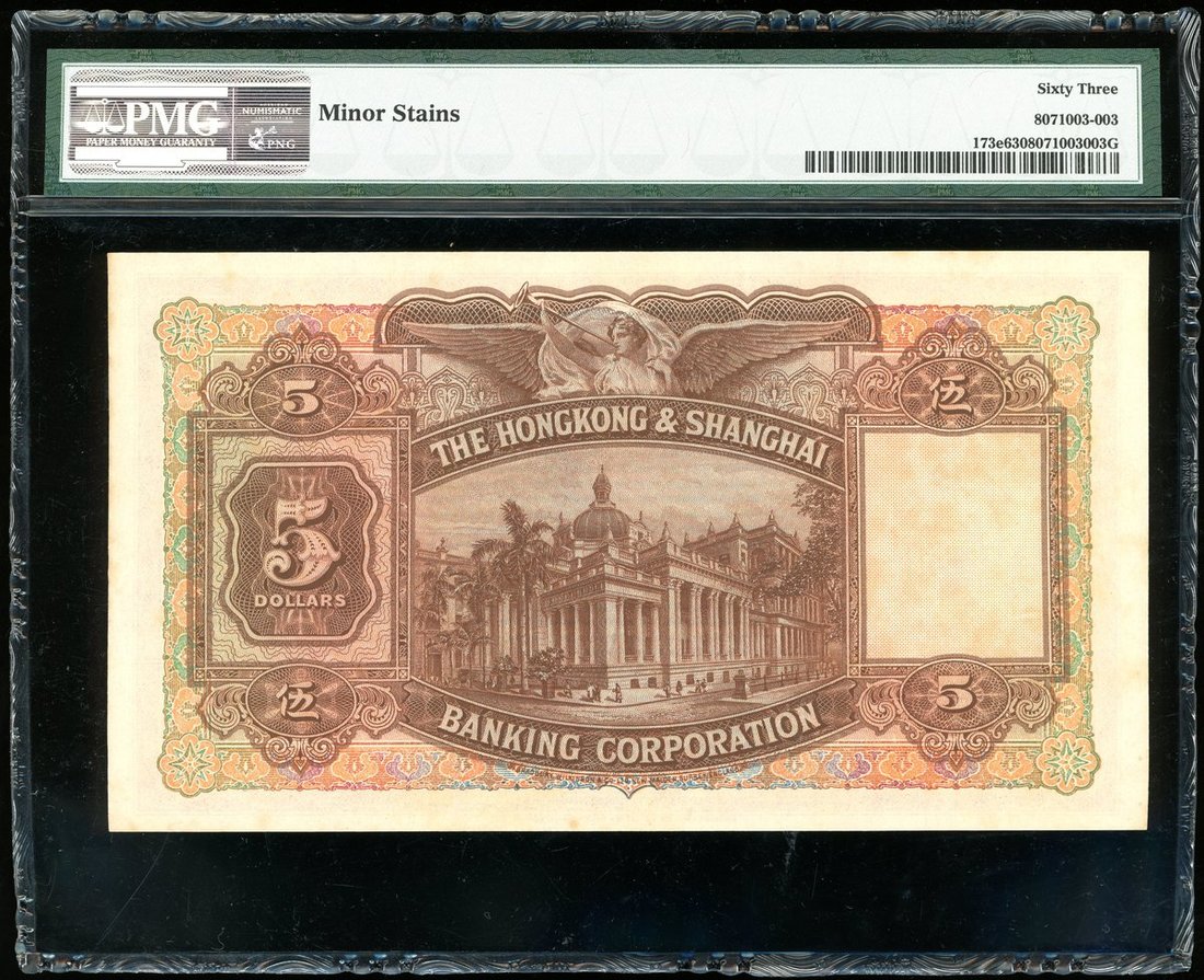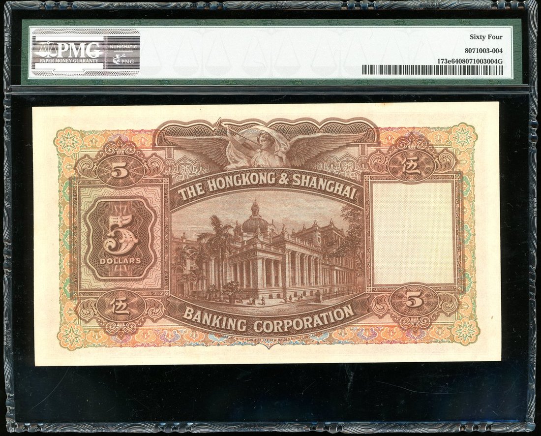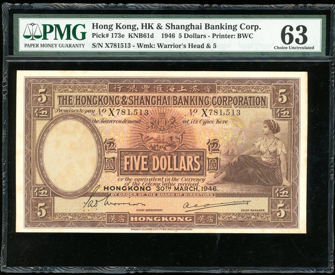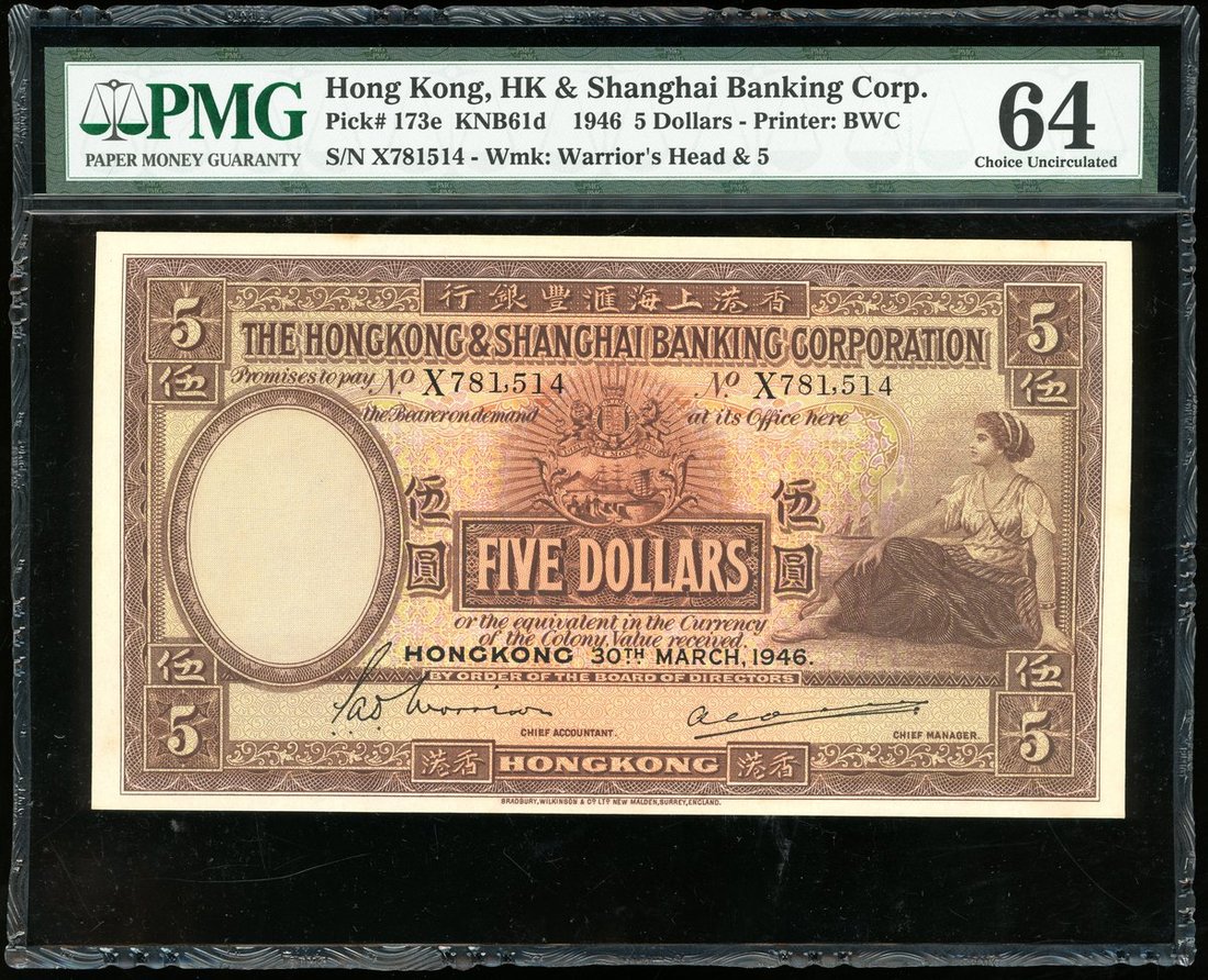 Hong Kong & Shanghai Banking Corporation, a consecutive pair of $5, 1946, serial number X781513-4, (Pick 173e), foxing, graded PMG 63 (Minor Stains) and 64 choice uncirculated.(2)