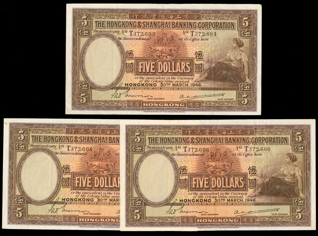 The Hongkong and Shanghai Banking Corporation, lot of 3x $5, 30.3.1946, near consecutive serial numbers T372603, 604 and 606, (Pick 173e), crisp very fine (3)