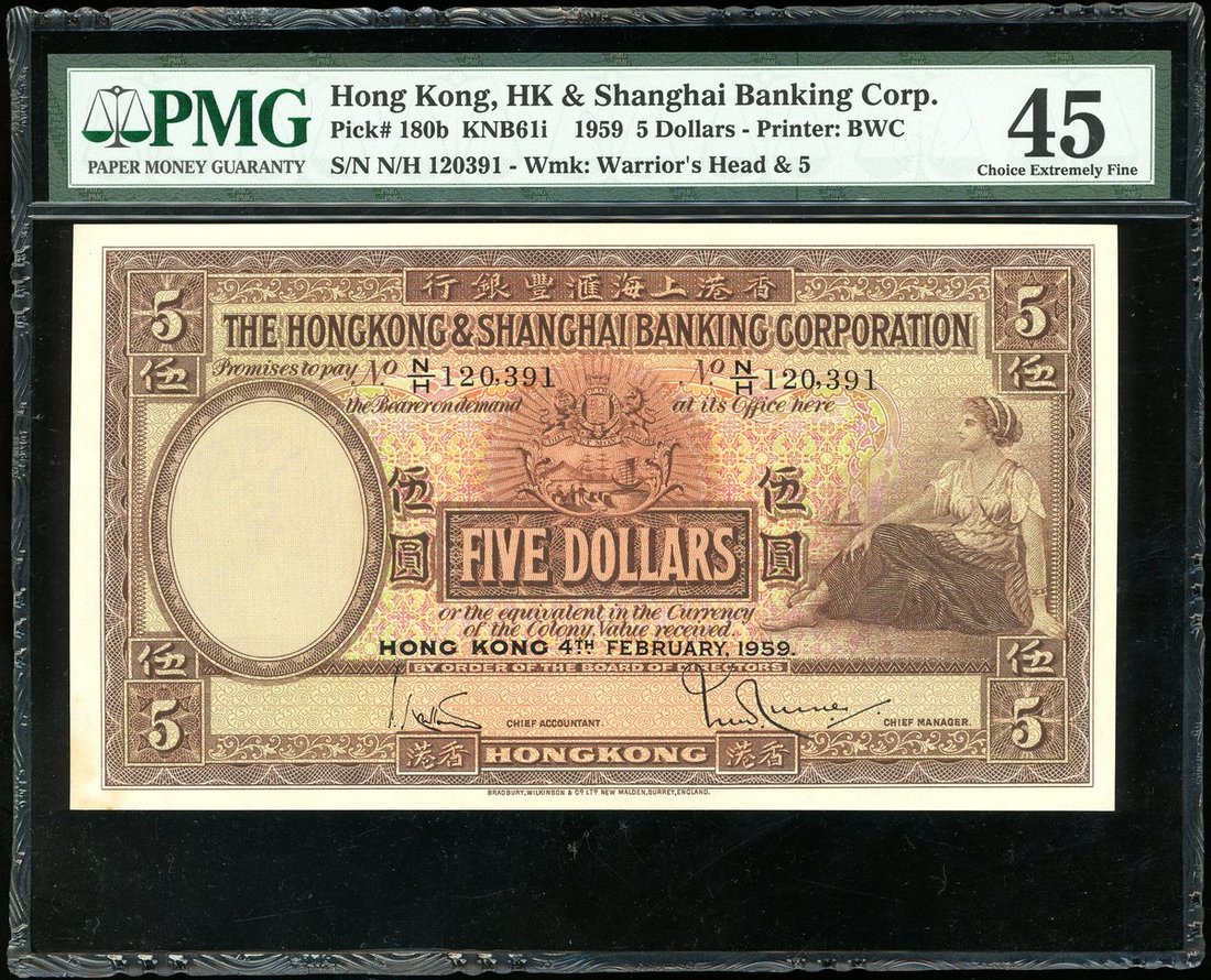 1959年匯豐銀行5元,編號N/H120391,PMG 45,紙角有漬