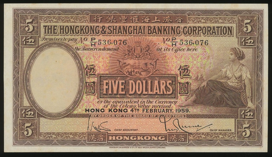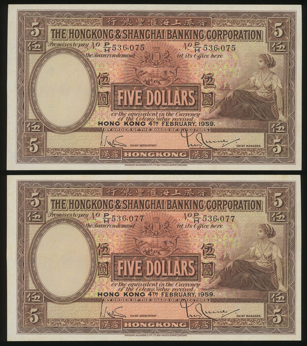 The Hongkong and Shanghai Banking Corporation, group of 3x $5, 4.2.1959, consecutive serial numbers P/H 536075-077, (Pick 180b), crisp extremely fine wih crossfolds and foxing (3)