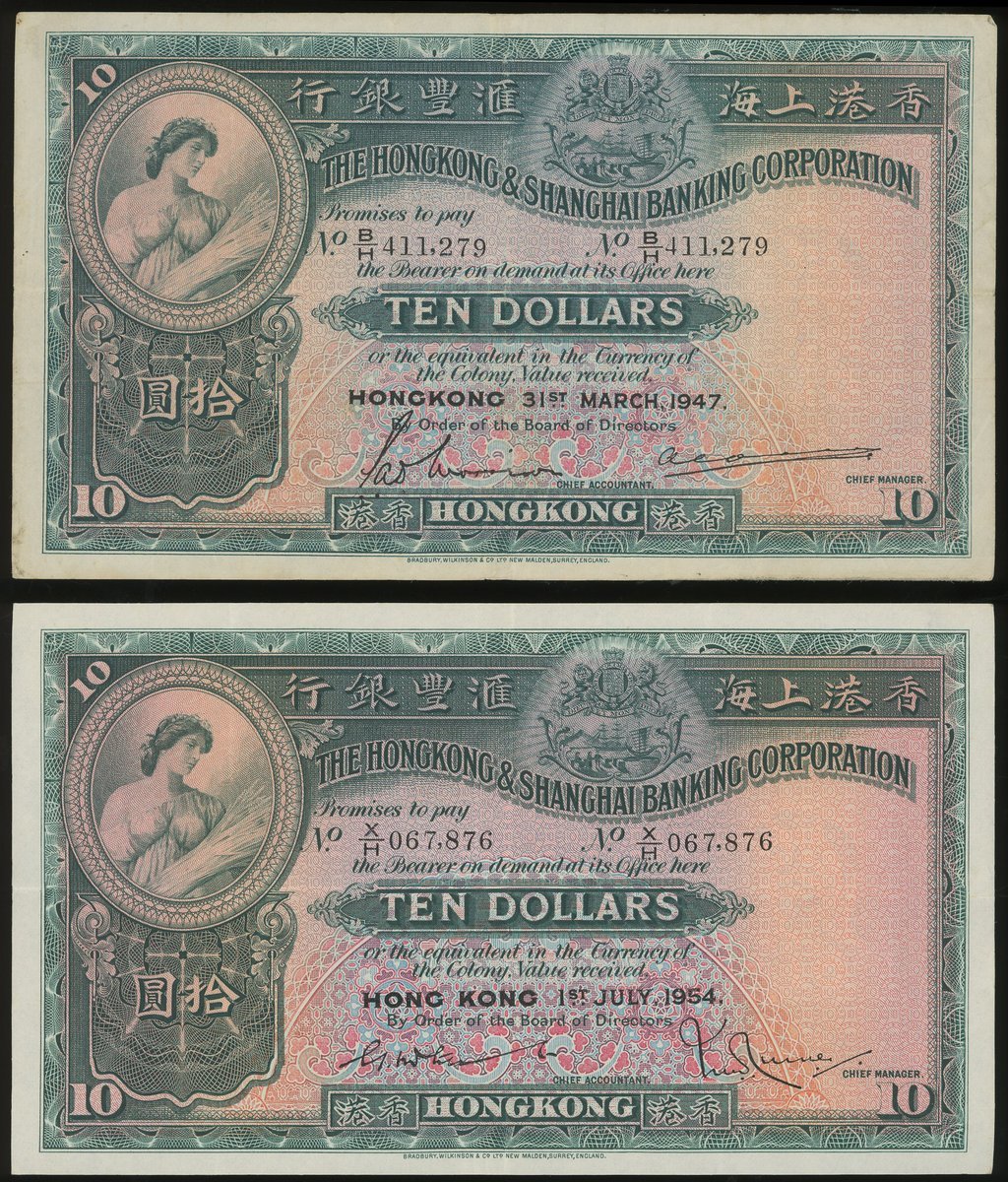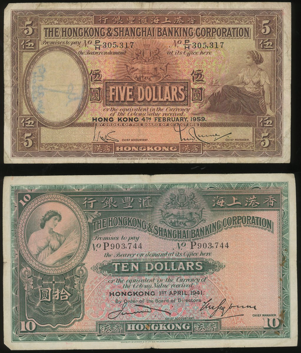 The HongKong & Shanghai Banking Corporation, group of 4 large sized notes, $5, 1959 and $10, 1941, 1947 and 1954,