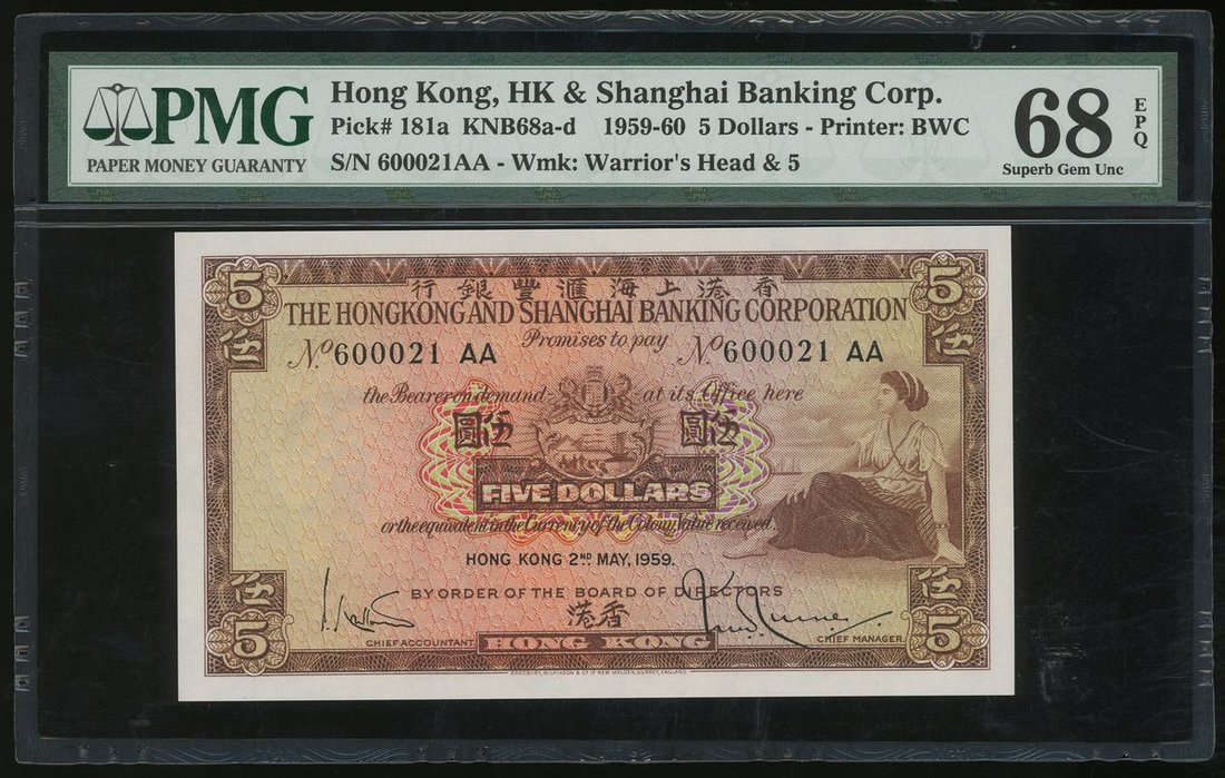 The HongKong and Shanghai Banking Corporation, $5, 2.5.1959, first AA prefix 600021, (Pick 181a), PMG 68EPQ Superb Gem Uncirculated and choice