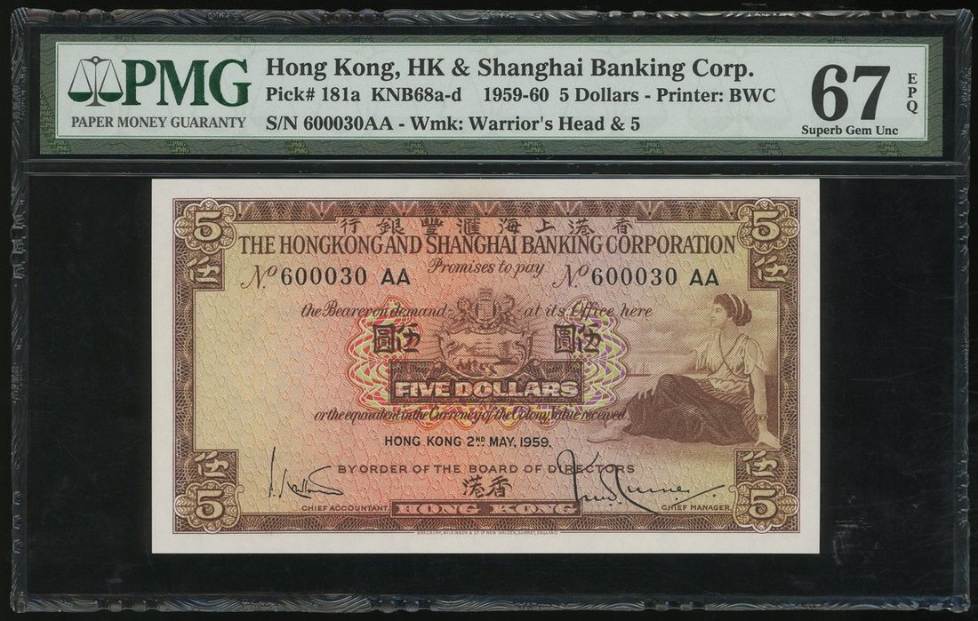 The HongKong and Shanghai Banking Corporation, $5, 2.5.1959, first AA prefix 600030, (Pick 181a), PMG 67EPQ Superb Gem Uncirculated and choice