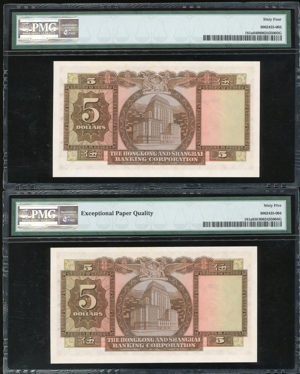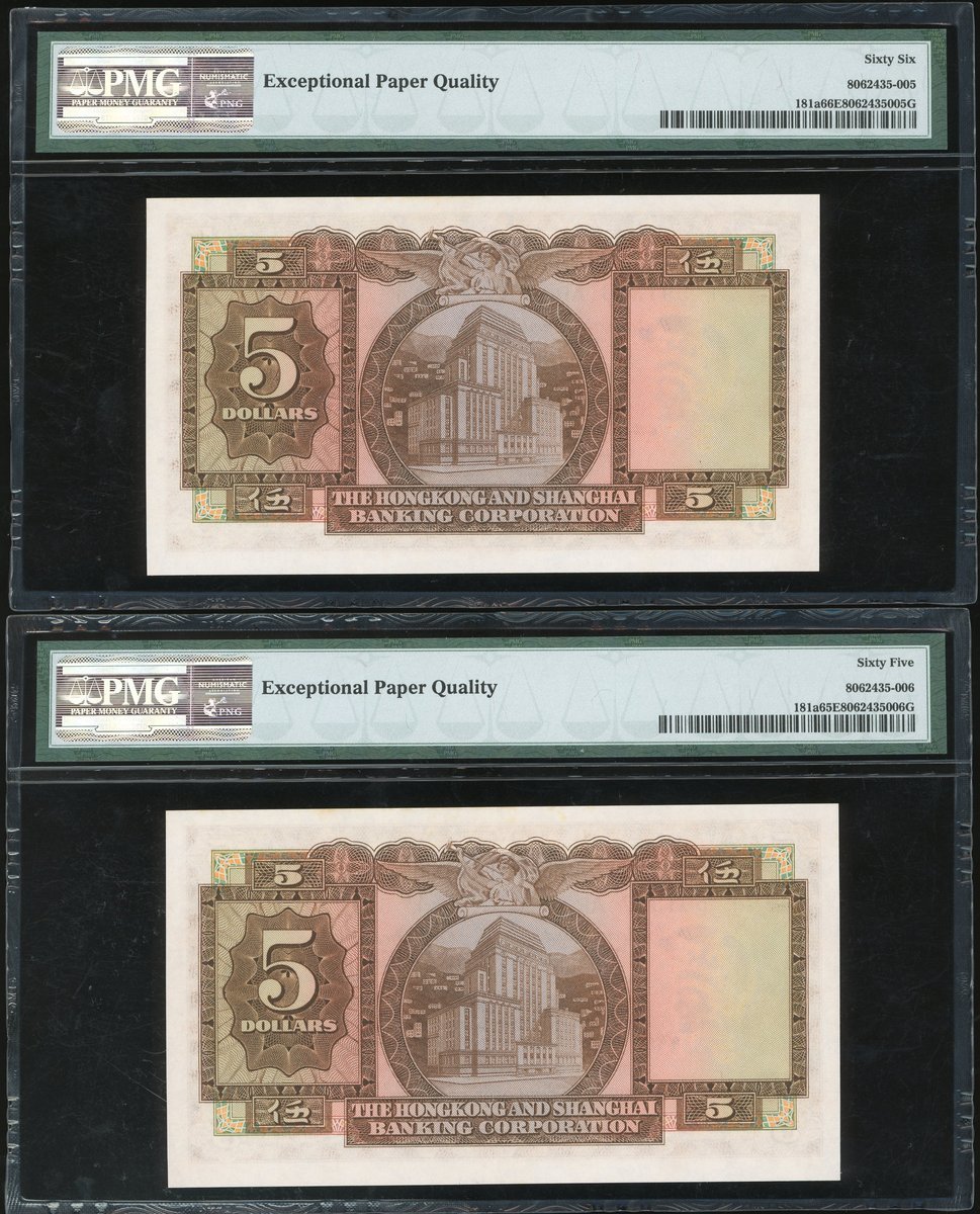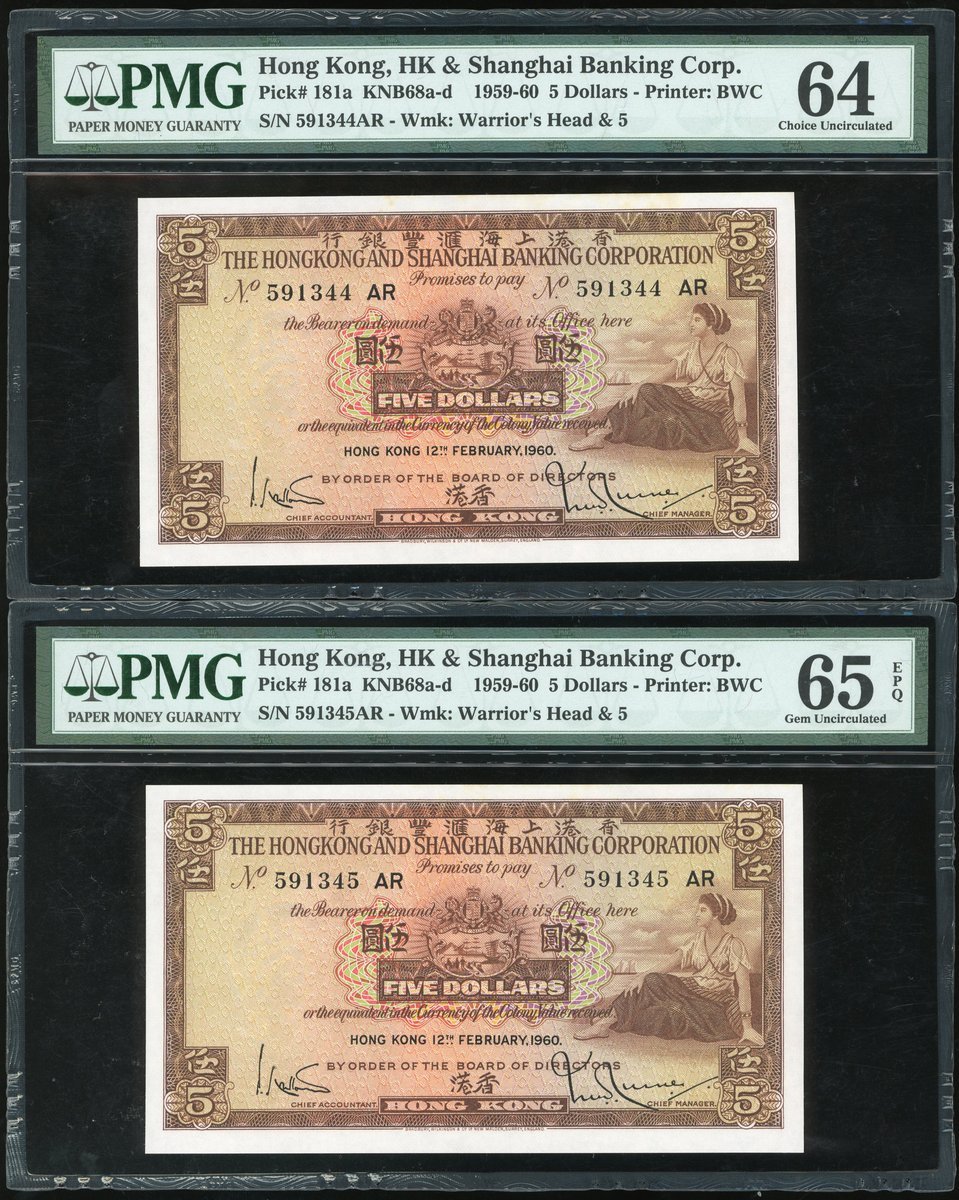 The HongKong and Shanghai Banking Corporation, $5, 12.2.1960, consecutive serial numbers 591344-347 AR, (Pick 181a), graded PMG64, 65EPQ, 66EPQ and 65EPQ respectively (4)