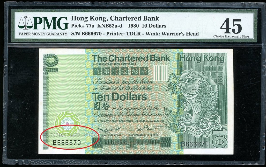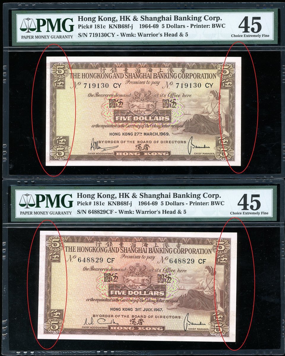 香港錯體鈔票一組3枚,包括1969及1967年匯豐銀行5元多墨錯體,編號719130 CY及648829 CF,1980年渣打銀行10元下方印刷錯誤,編號B666670,均PMG 45,標籤未有註明錯體,原況出售,不設退換