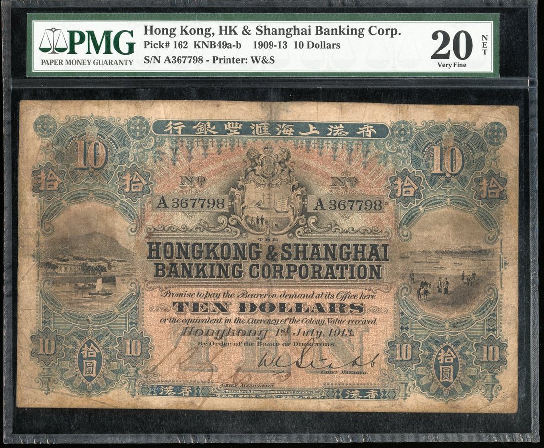 The HongKong and Shanghai Banking Corporation, $10, 1.7.1913, serial number A367798, blue on red underprint, waterfront at left, horseman and walkers at right, handsigned signature at bottom, reverse olive green and brown, HSBC building at centre,