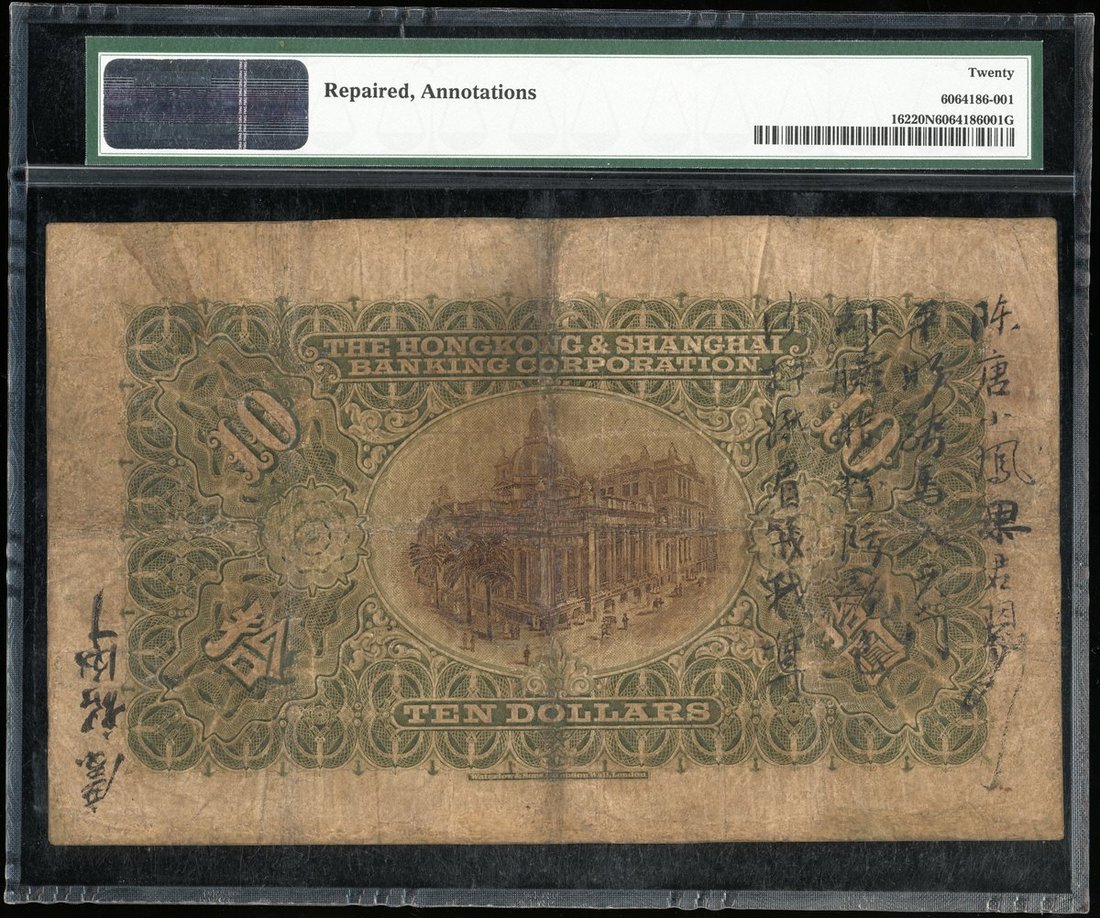 1913年匯豐銀行10元,編號A367798,PMG 20NET,有修補及書寫,早期票
