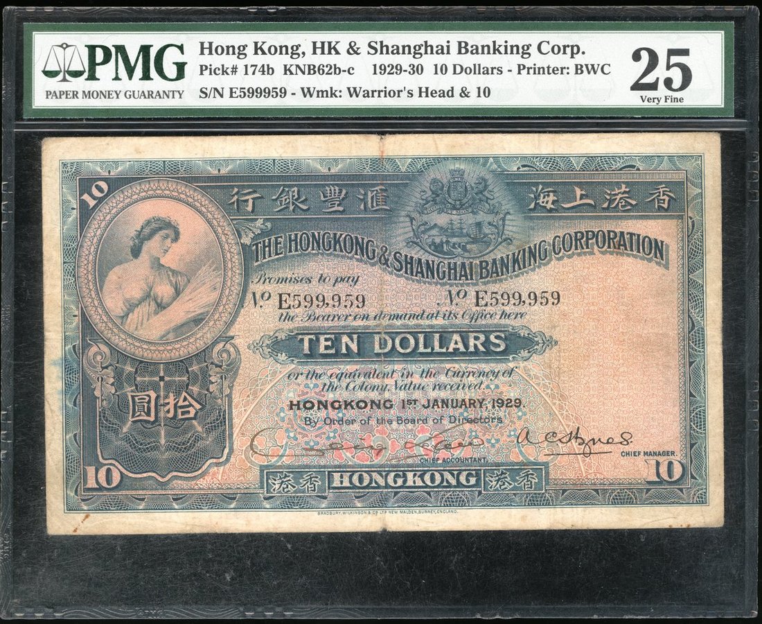The HongKong and Shanghai Banking Corporation, $10, 1.1.1929, serial number E599959, handsigned at lower left,