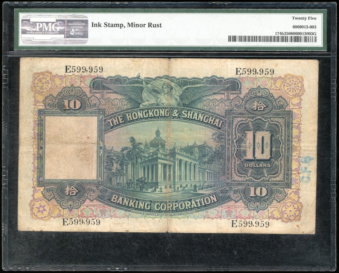 1929年匯豐銀行10元,編號E599959,PMG 25,有墨水印及輕微鏽漬