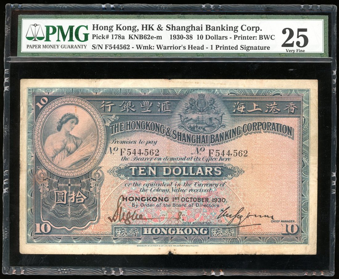 The HongKong and Shanghai Banking Corporation, $10, 1.10.1930, serial number F544562, handsigned at lower left,