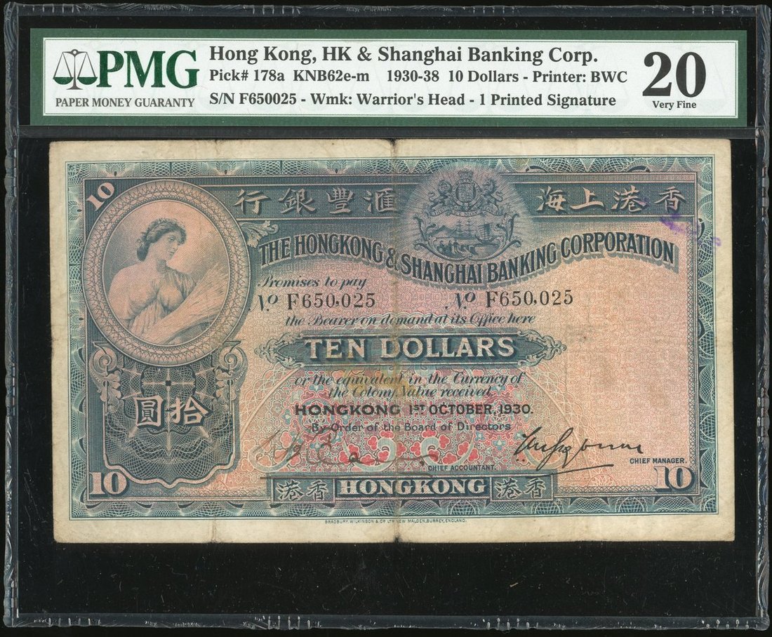 Hong Kong and Shanghai Banking Corporation, $10, 1st October 1930, serial number F650025, handsigned signature at low left,