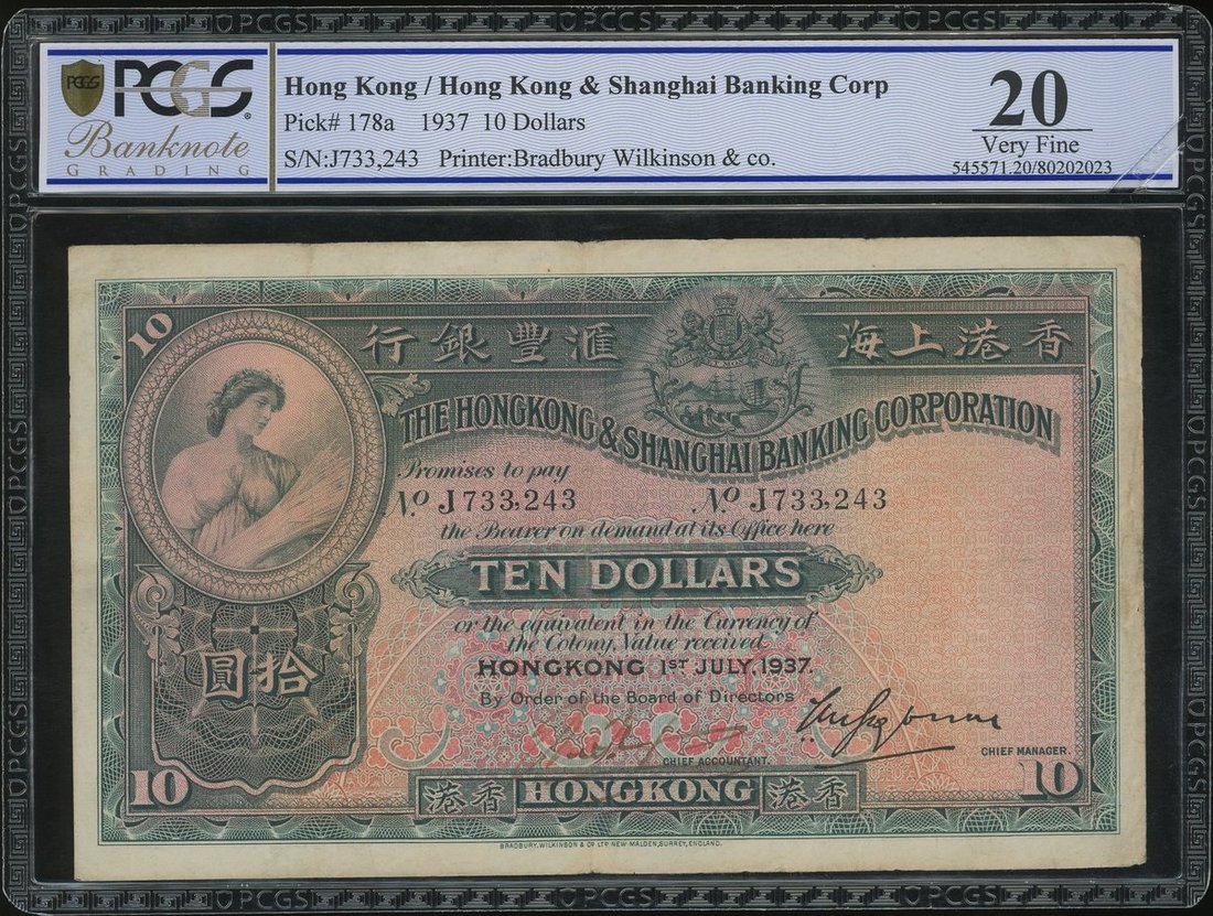 The HongKong and Shanghai Banking Corporation, $10, 1.7.1937, serial number J733243, handsigned at lower left,