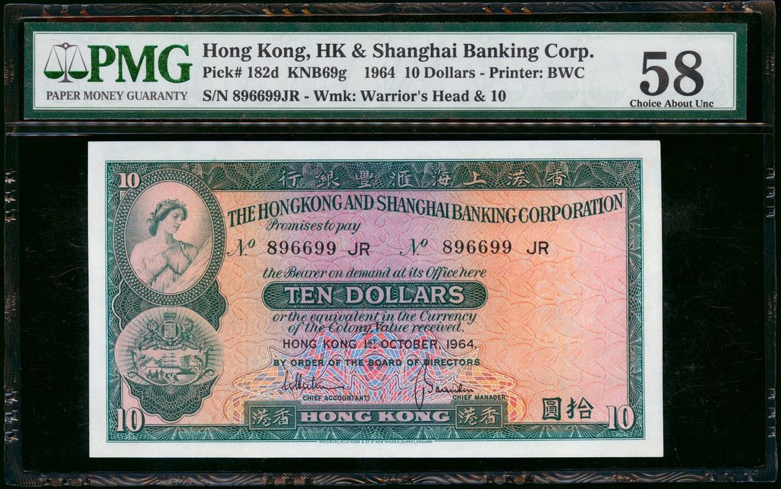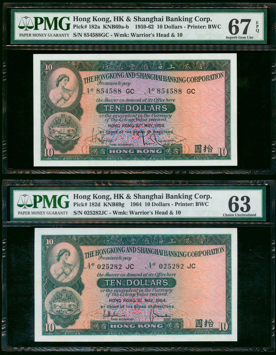 匯豐銀行10元3枚一組,包括1959年,1964年5月及1964年10月,分別評PMG67EPQ,63(有微污)及58,最後一枚為此系列的重要年份