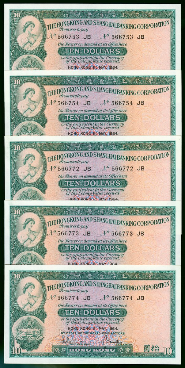 The Hongkong and Shanghai Banking Corporation, group of 5x $10, 1.5.1964, consecutive serials 566772JB-774JB and 566753JB-754JB, (Pick 182c), crisp about uncirculated with strong centre fold crease (5)