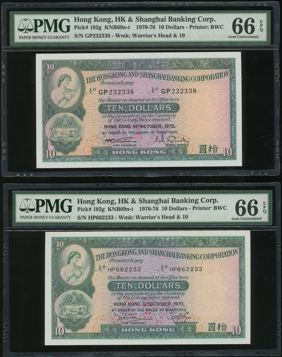 The Hongkong and Shanghai Banking Corporation, a pair of $10, 31.10.1972 and 31.10.1973, serial numbers GP232338 and HP662233, (Pick 182g), both graded PMG 66EPQ Gem Uncirculated (2)