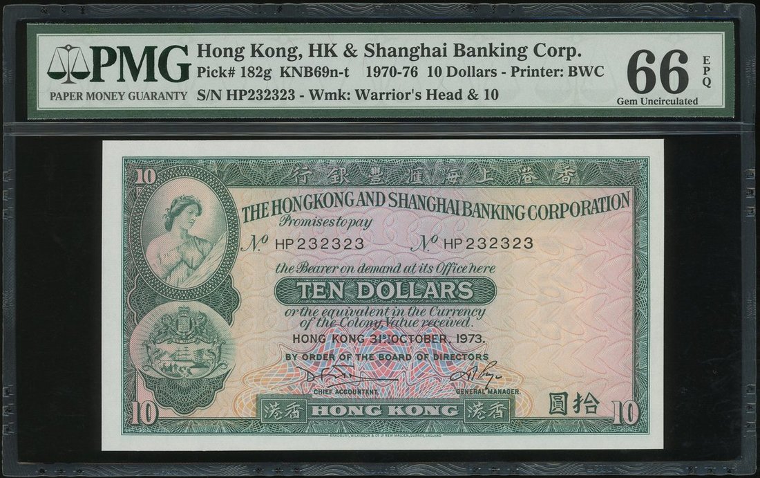 The HongKong and Shanghai Banking Corporation, $10, 31.10.1973, repeater serial number HK232323, (Pick 182g), PMG 66EPQ Gem Uncirculated