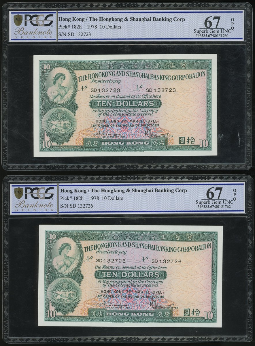 The Hongkong and Shanghai Banking Corporation, a pair of $10, 31.3.1978, serial numbers SD132723 and 26, (Pick 182h), both graded PCGS Banknote 67OPQ Superb Gem Uncirculated (2)