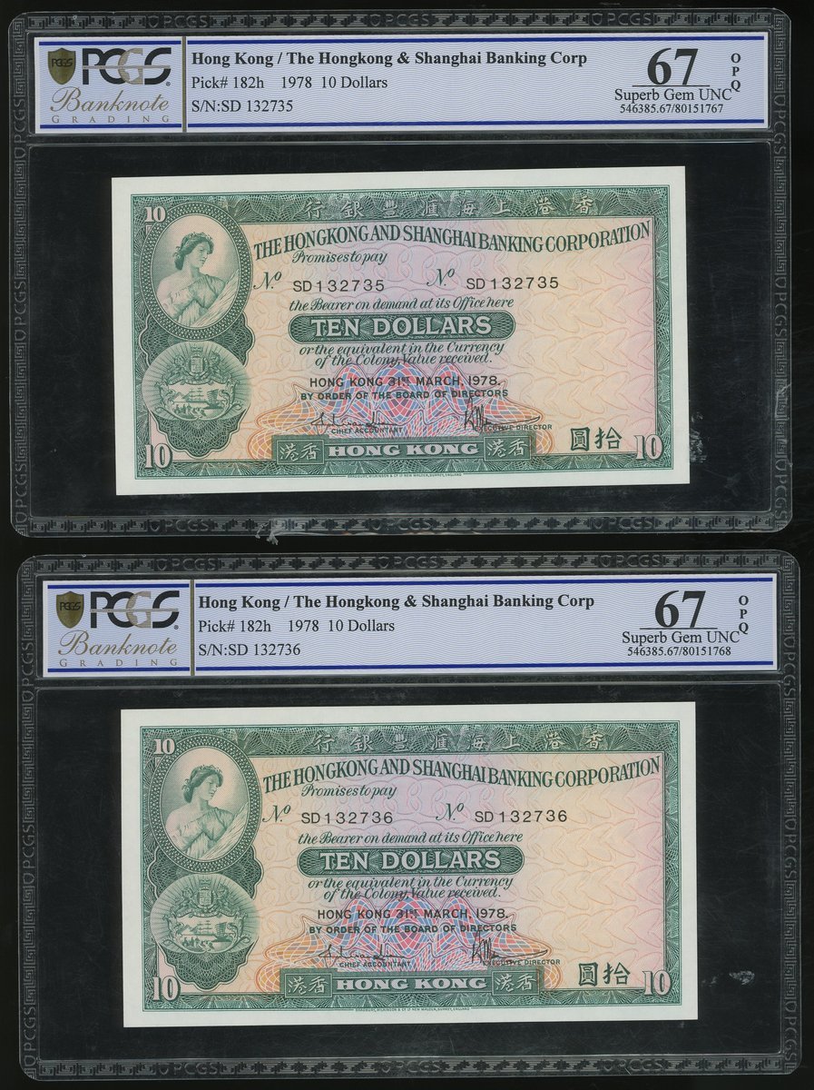 The Hongkong and Shanghai Banking Corporation, a pair of $10, 31.3.1978, consecutive serial numbers SD132735-36, (Pick 182h), both graded PCGS Banknote 67OPQ Superb Gem Uncirculated (2)