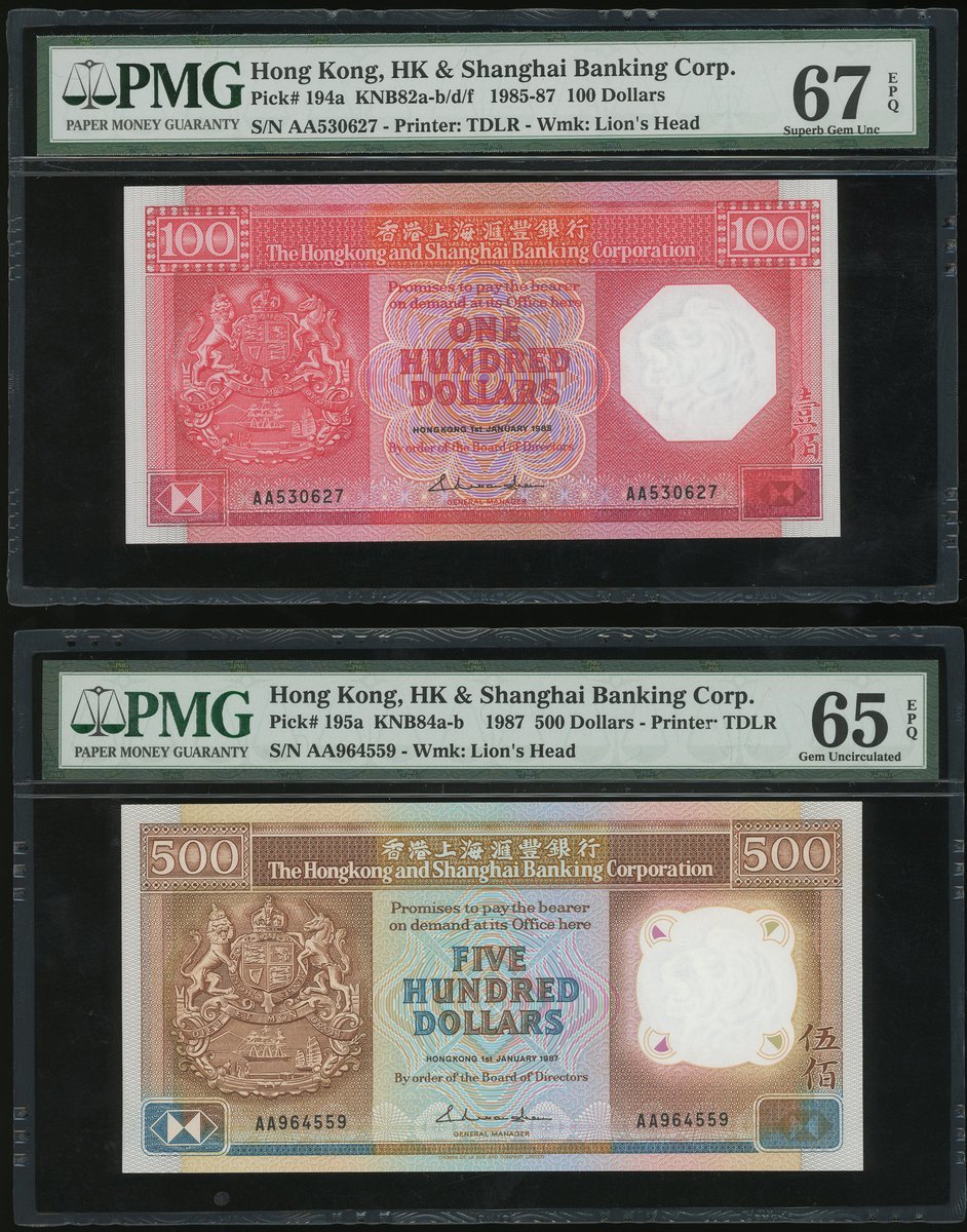 匯豐銀行一組4枚,包括1989年10元,1985年50及100元,及1987年500元,均AA字軌,分別PMG 66EPQ,67EPQ,67EPQ及65EPQ