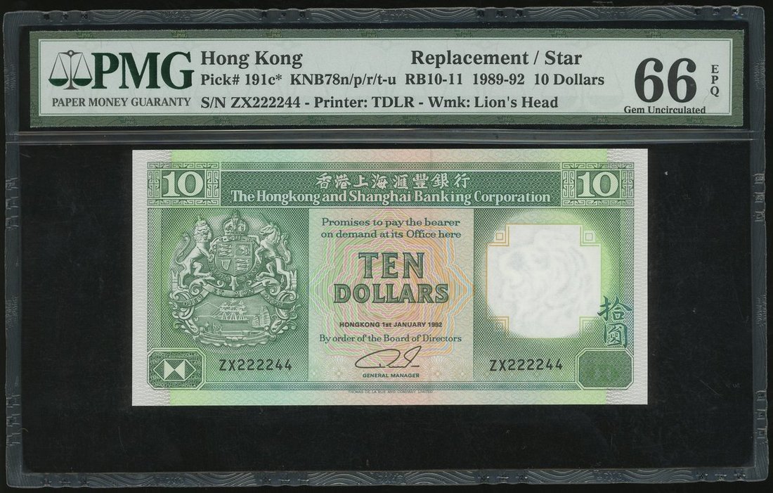 The Hongkong and Shanghai Banking Corporation, $10, 1.1.1992, semi-solid replacement serial ZX2222244, (Pick 191c*), PMG 66EPQ Gem Uncirculated