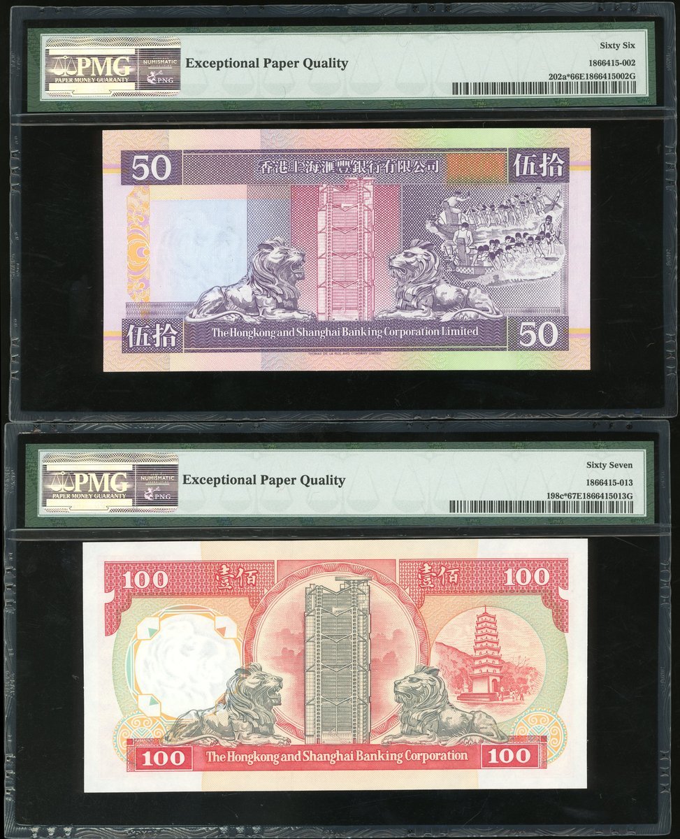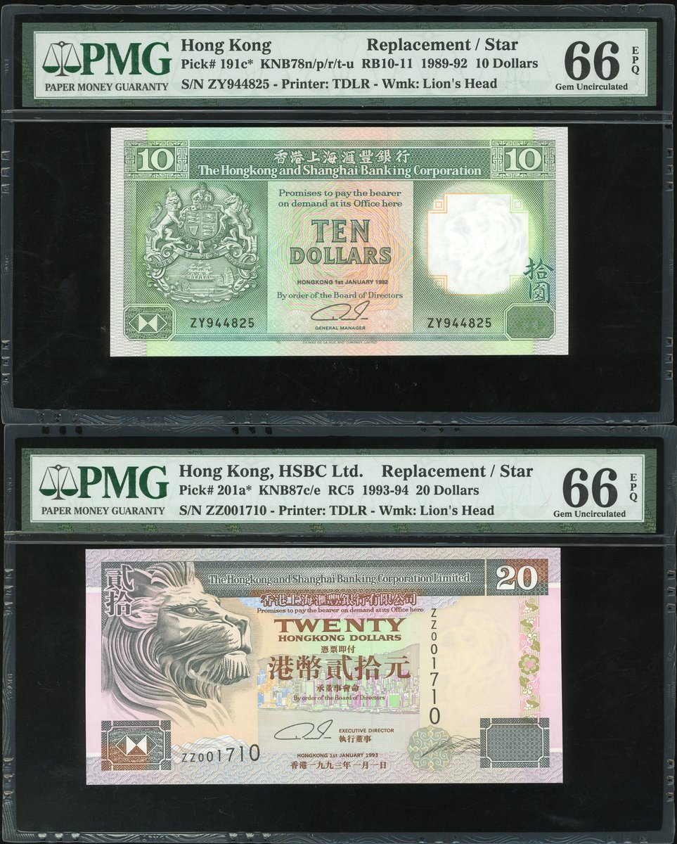 匯豐銀行補版一組4枚,1992年10元、1993年20元、1994年50元及1991年100元,編號ZY944825,ZZ001710,ZZ027918及ZZ565834,除100元PMG 67EPQ外,其餘PMG 66EPQ