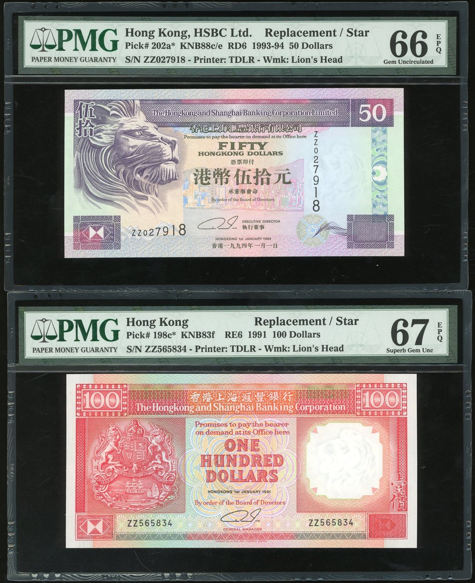 The HongKong and Shanghai Banking Corporation, group of 4 replacement notes, $10, 1.1.1992, ZY944825, $20, 1.1.1993, ZZ001710, $50, 1.1.1994, ZZ027918 and $100, 1.1.1991, ZZ565834,