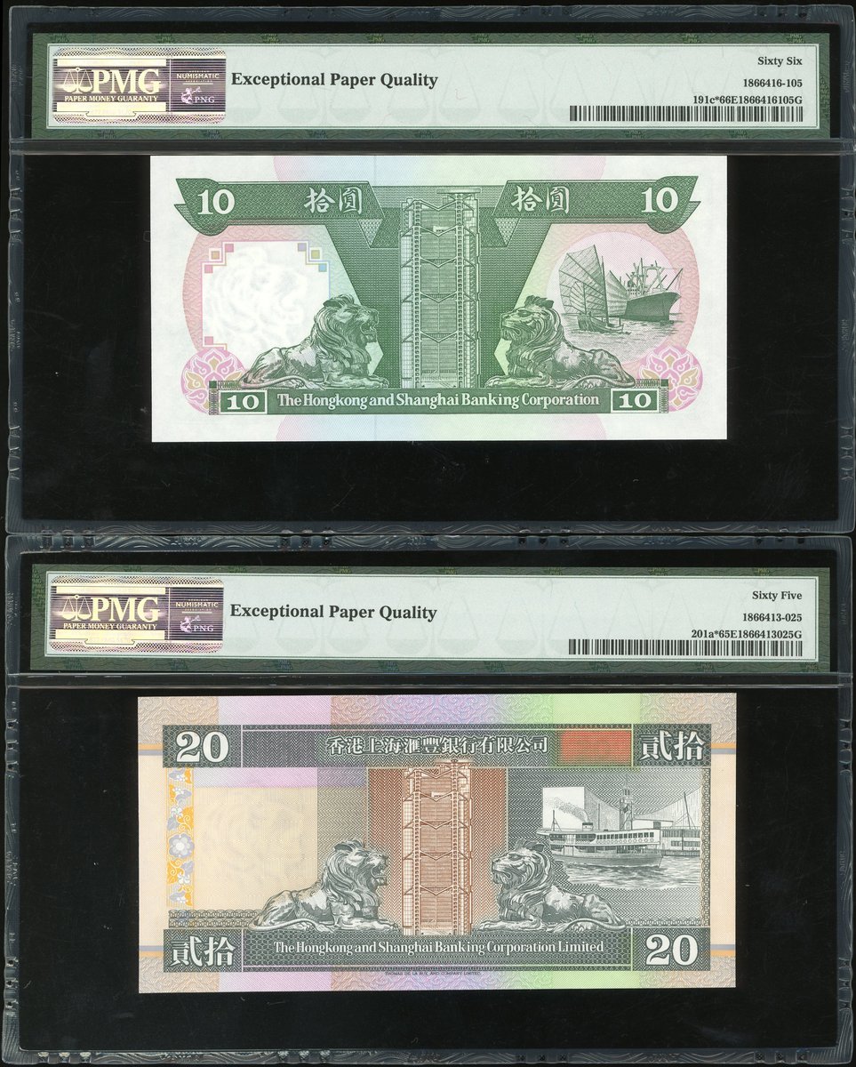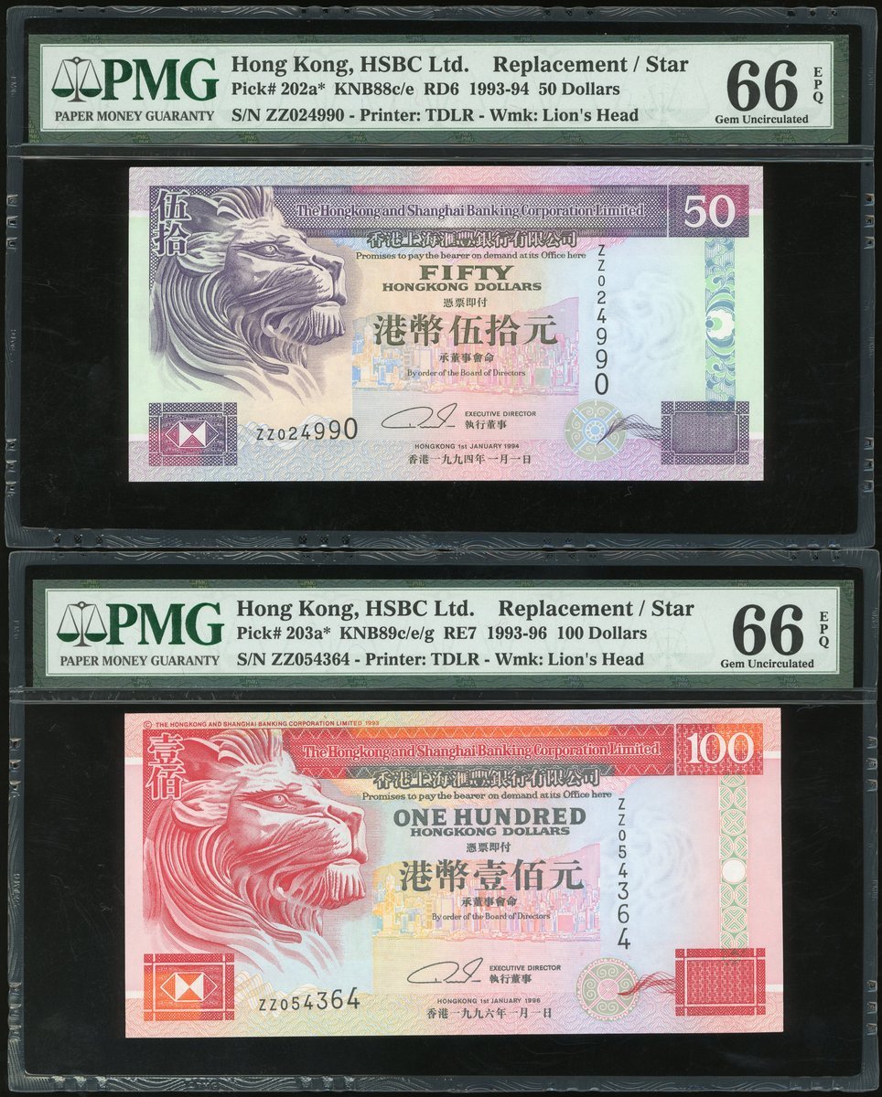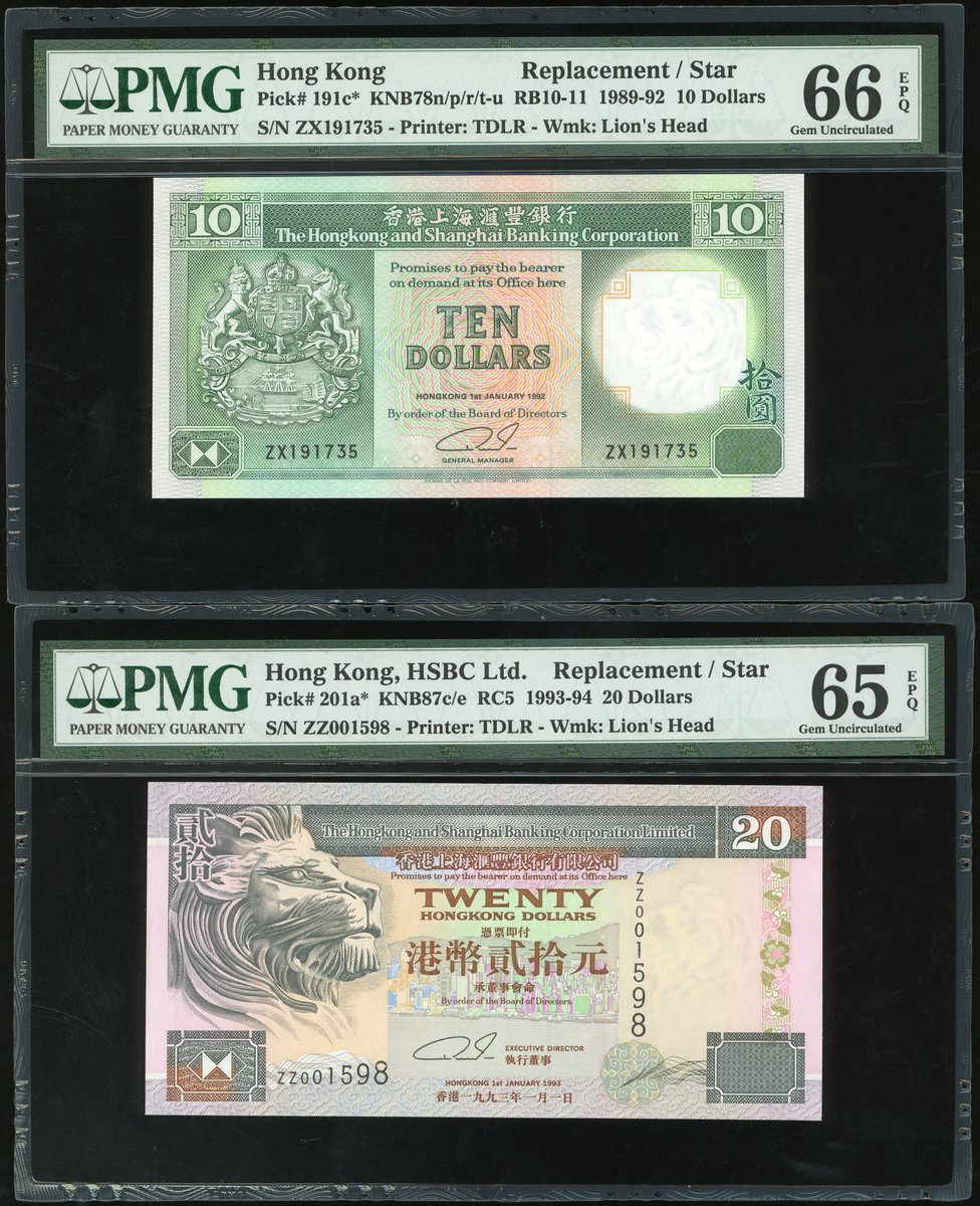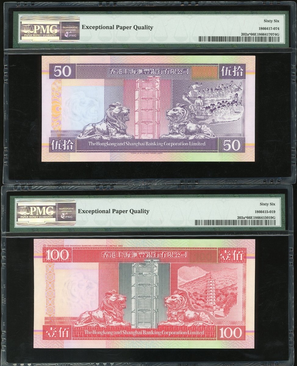 匯豐銀行補版一組4枚,1992年10元,1993年20元,1994年50元及1996年100元,編號 ZX191735,ZZ001598,ZZ024990及ZZ054364,除20元評65EPQ外,其餘均PMG 66EPQ