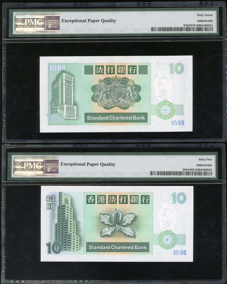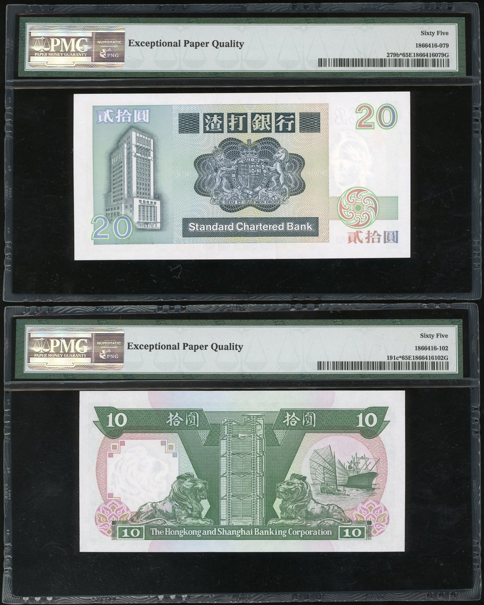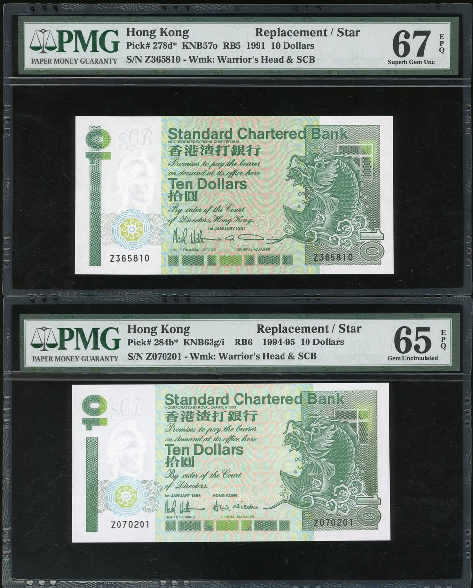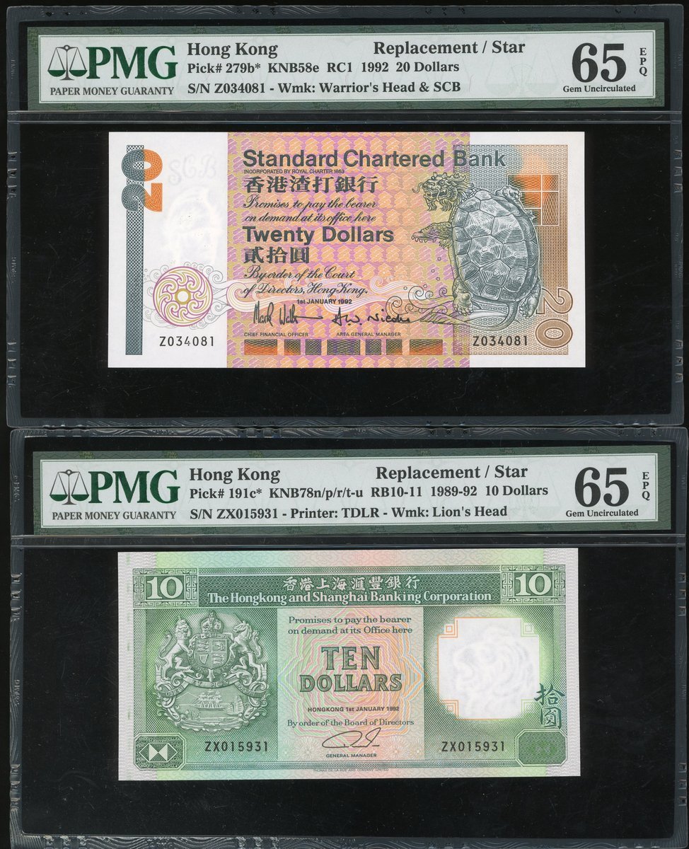 香港補版一組4枚,包括渣打銀行1991及94年10元、1992年20元及1992年匯豐銀行10元,編號 Z365810,Z070201,Z034081及ZX015931,分別評PMG 67EPQ,65EPQ,65EPQ及65EPQ