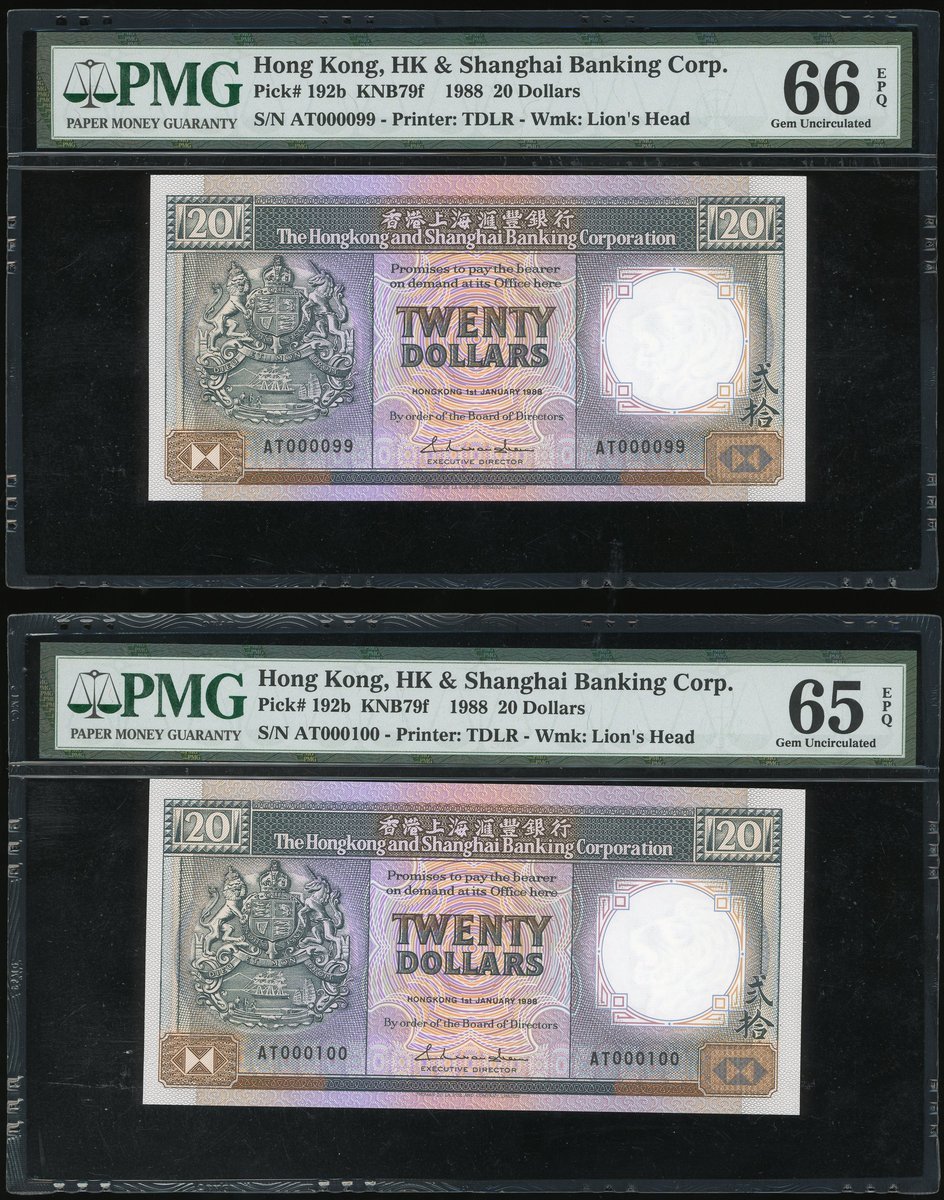 Hong Kong & Shanghai Banking Corporation, a pair of $20, 1988, serial number AT000099-100, (Pick 192b), PMG graded 66EPQ and 65EPQ respectively.(2)