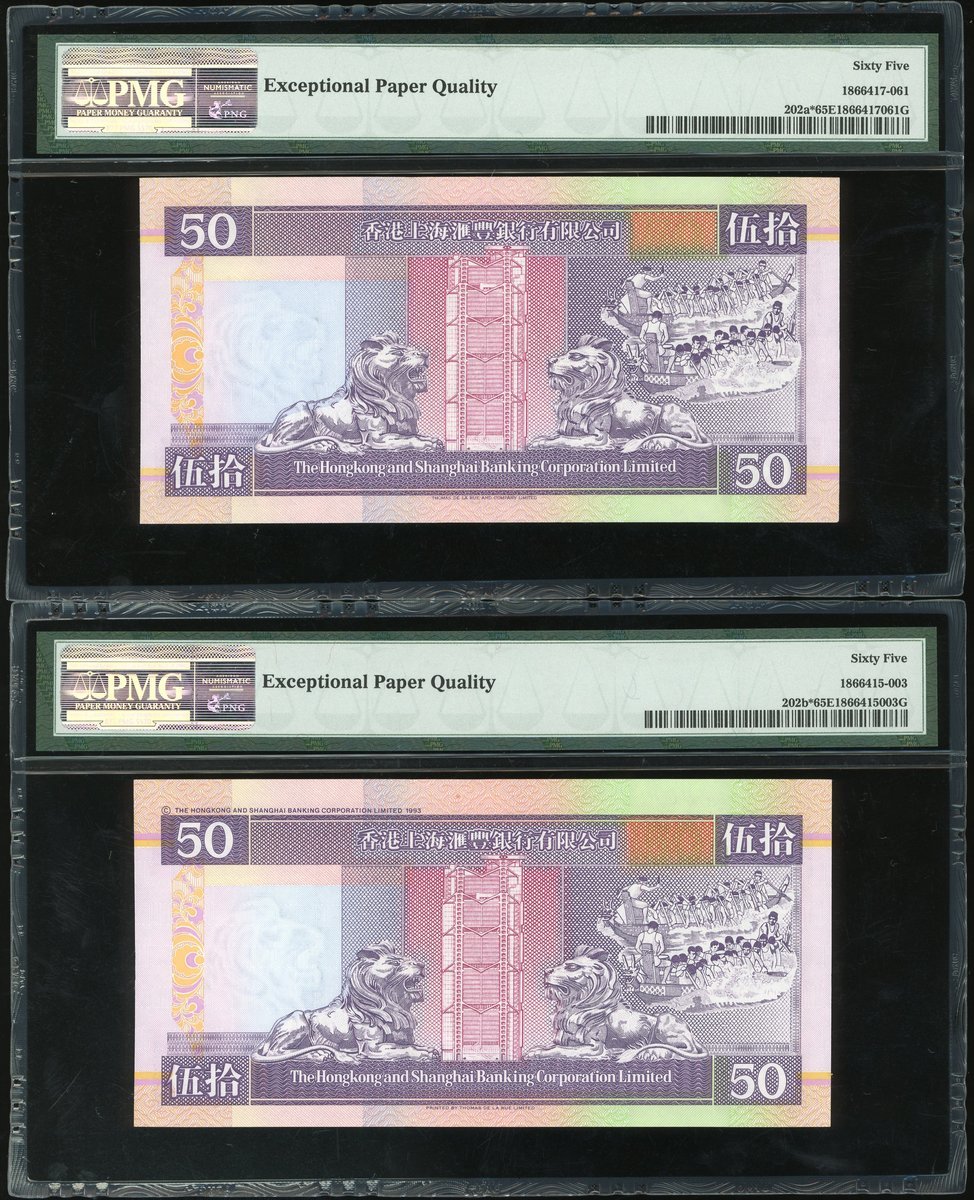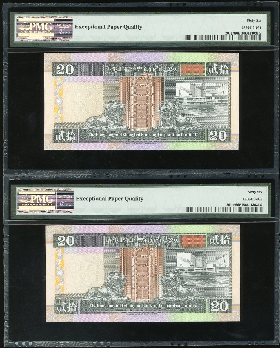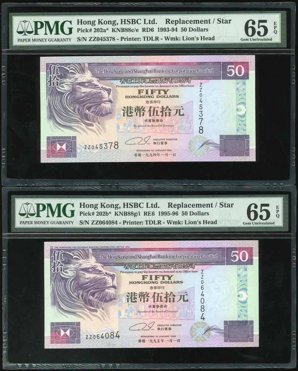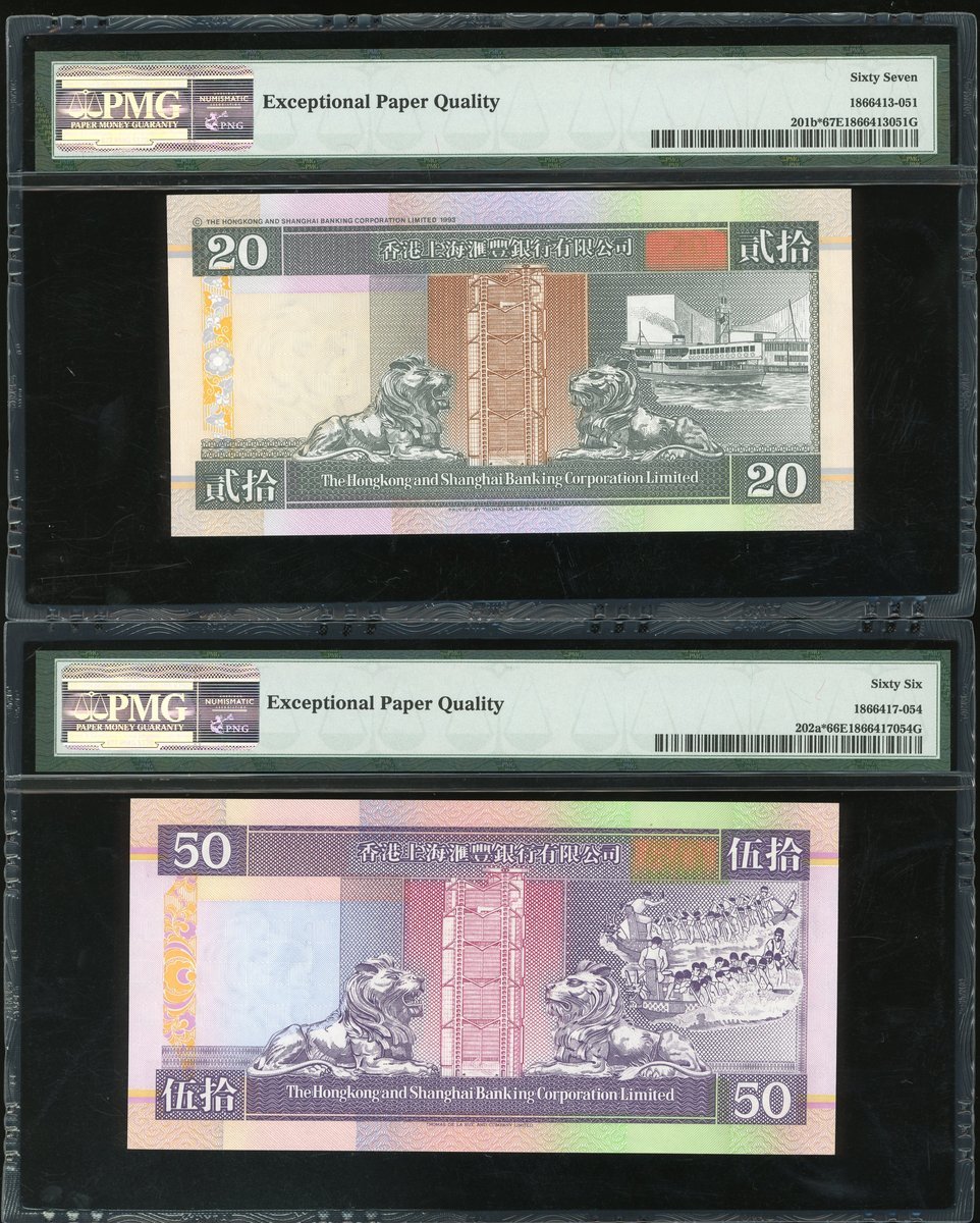 匯豐銀行補版一組6枚,1993,1994及1995年20元,及1993,1994及1995年50元,編號ZZ000973,ZZ022151,ZZ081678,ZZ000245,ZZ045378及ZZ064084,分別評PMG 66EPQ,66EPQ,67EPQ,66EPQ,65EPQ及65EPQ