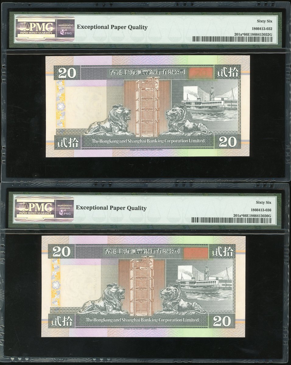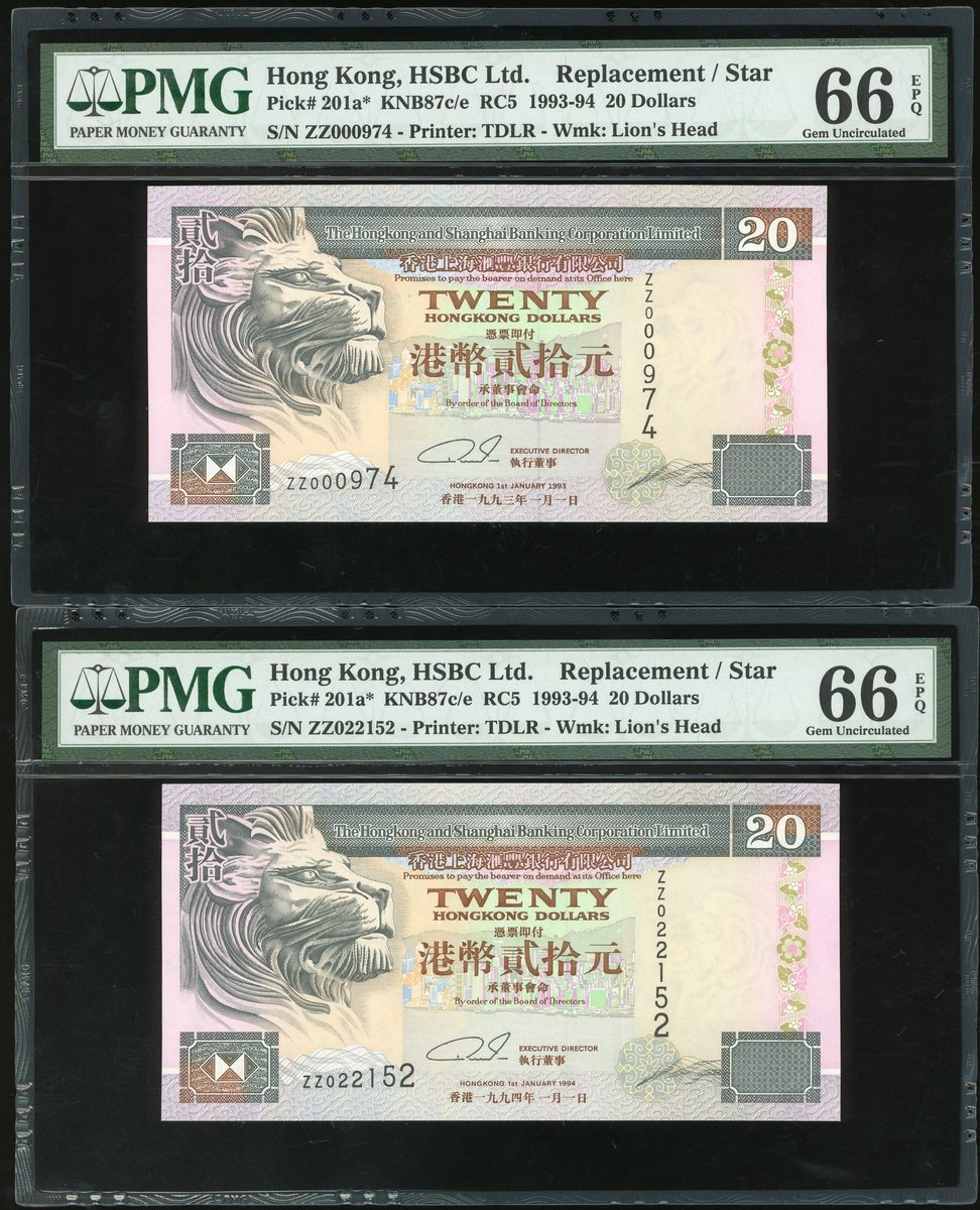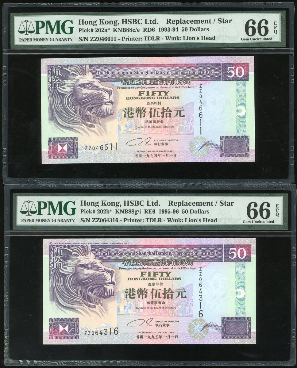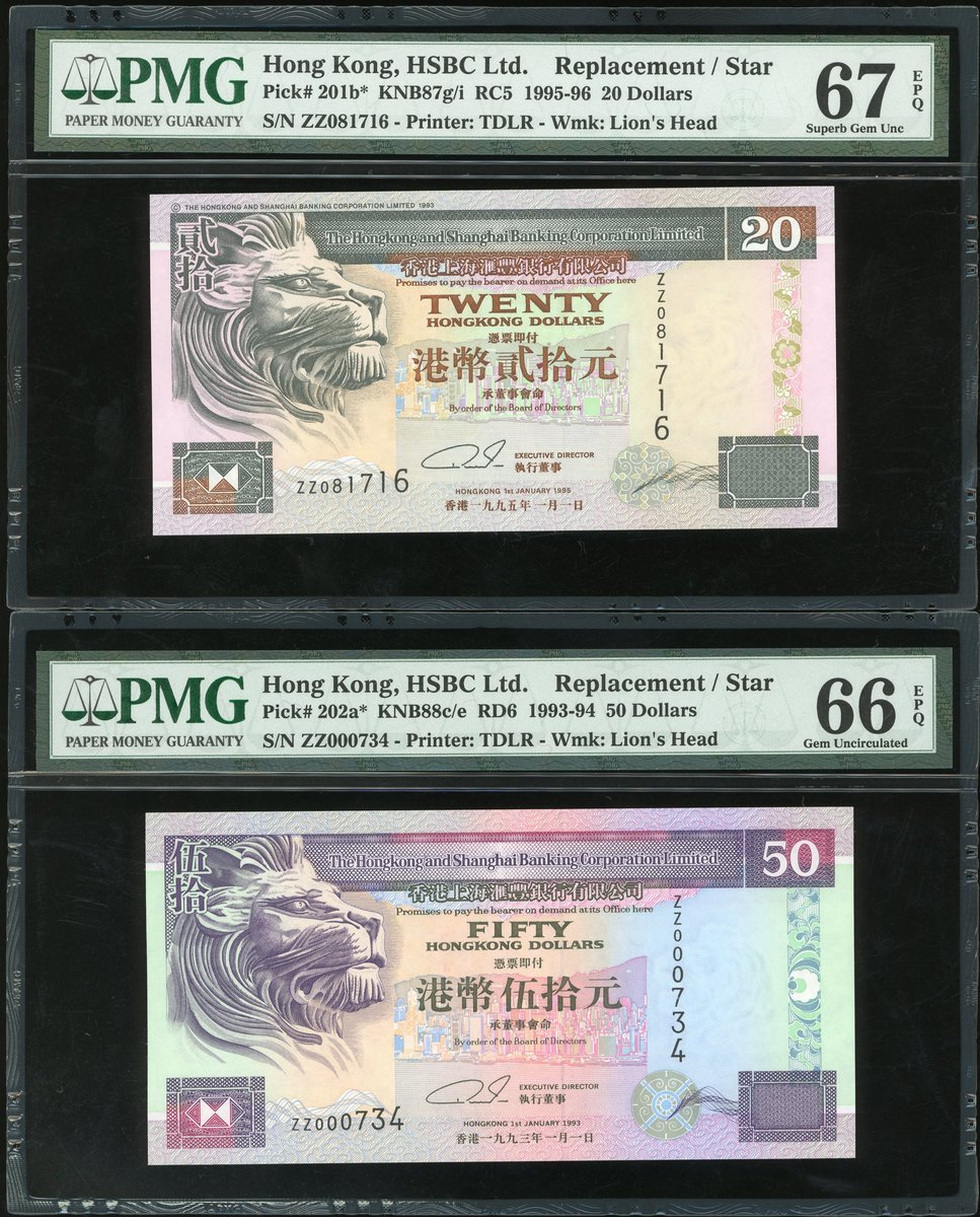 匯豐銀行補版一組6枚,1993,1994及1995年20元,及1993,1994及1995年50元,編號ZZ000974,ZZ022152,ZZ081716,ZZ000734,ZZ046611及ZZ064316,,除1995年20元評PMG 67EPQ外,其餘評PMG 66EPQ