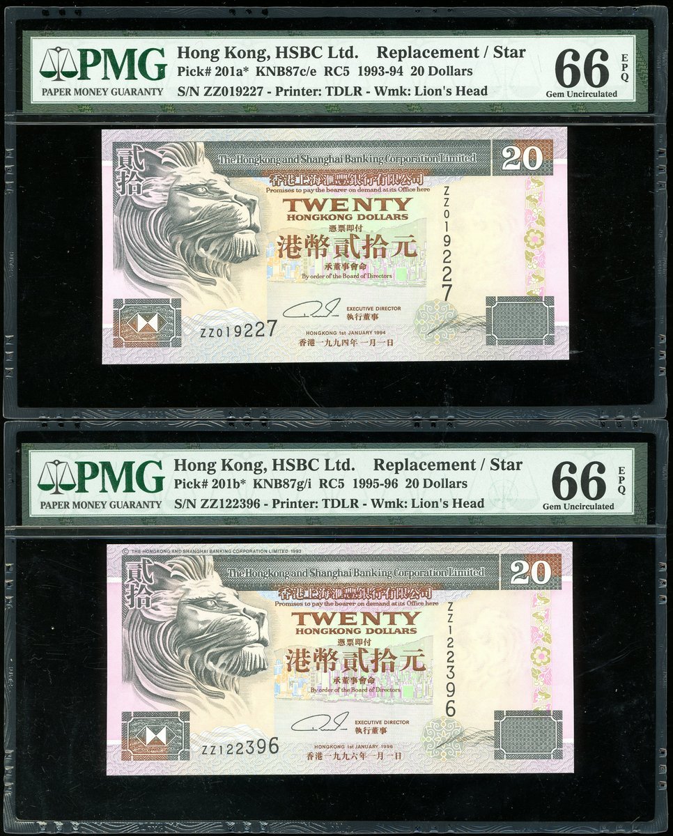 1994, 96及97年匯豐銀行補版20元一組3枚,編號ZZ019227,ZZ122396及ZZ157126,均PMG 66EPQ