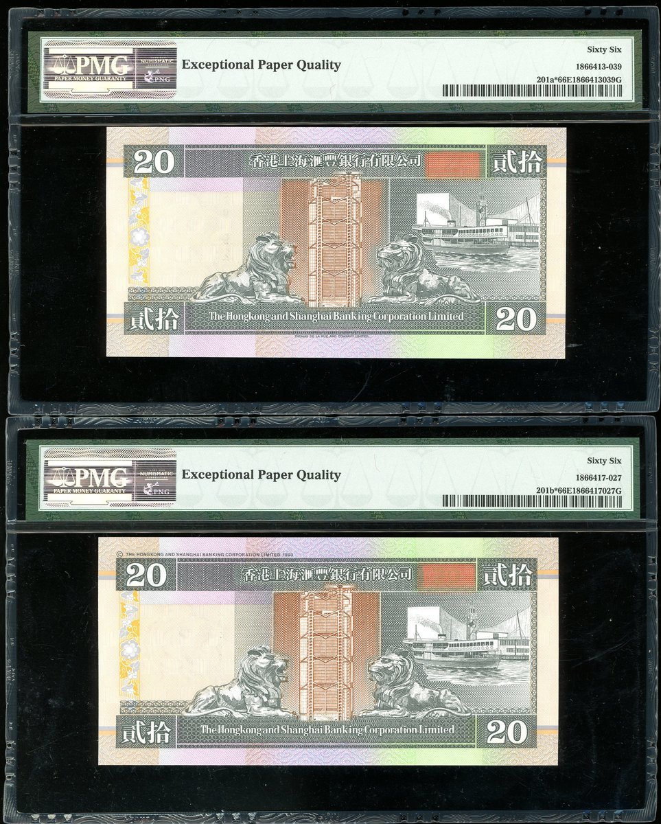 The Hongkong and Shanghai Banking Corporation, group of 3x $20, 1.1.1994, 1.1.1996 and 1.1.1997, ZZ019227, ZZ122396 and ZZ157126, (Pick 201a*, 201b*, 201c*), all graded PMG 66EPQ Gem Uncirculated (3)