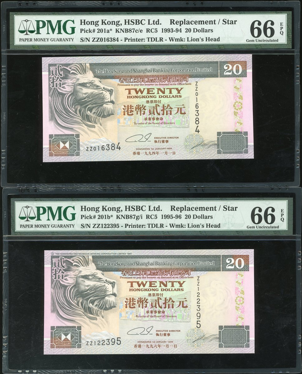 The Hongkong and Shanghai Banking Corporation, group of 3x $20, 1.1.1994, 1.1.1996 and 1.1.1997, ZZ016384, ZZ122395 and ZZ157053, (Pick 201a*, 201b*, 201c*), all graded PMG 66EPQ Superb Gem Uncirculated (3)