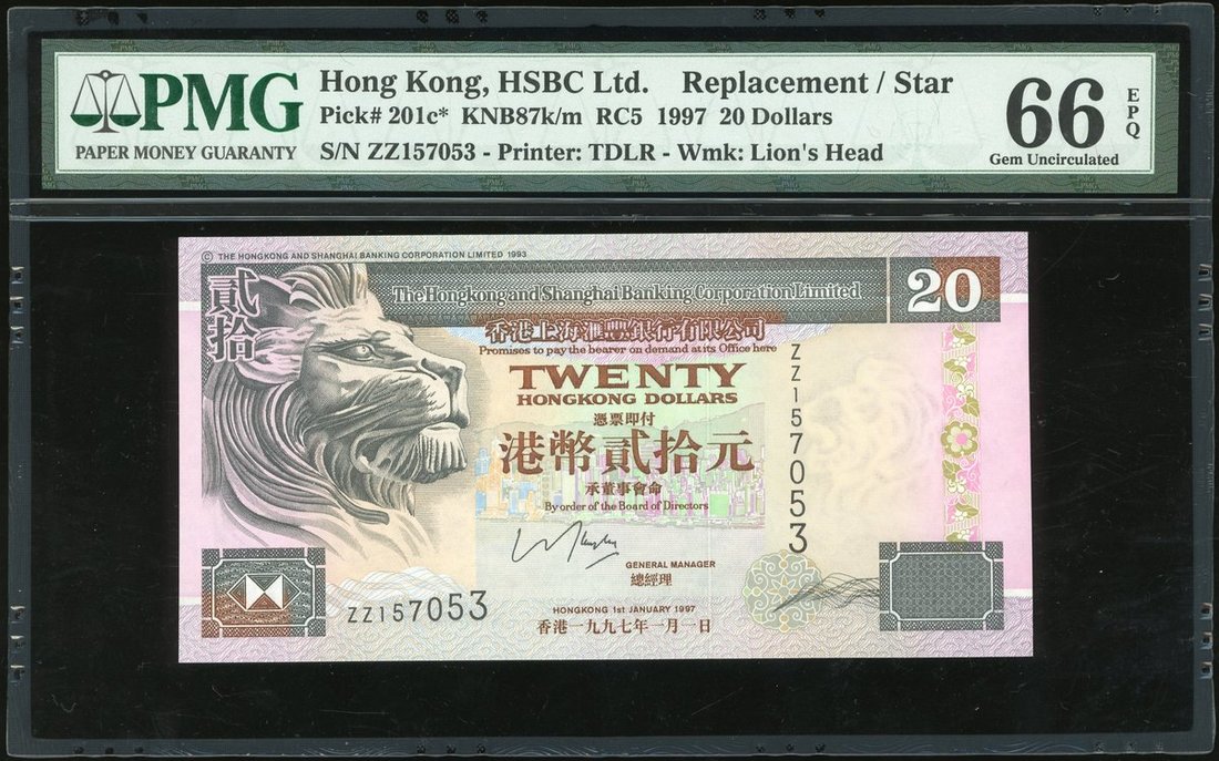 1994, 96及97年匯豐銀行補版20元一組3枚,編號ZZ016384,ZZ122395及ZZ157053,均PMG 66EPQ