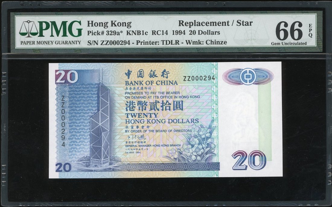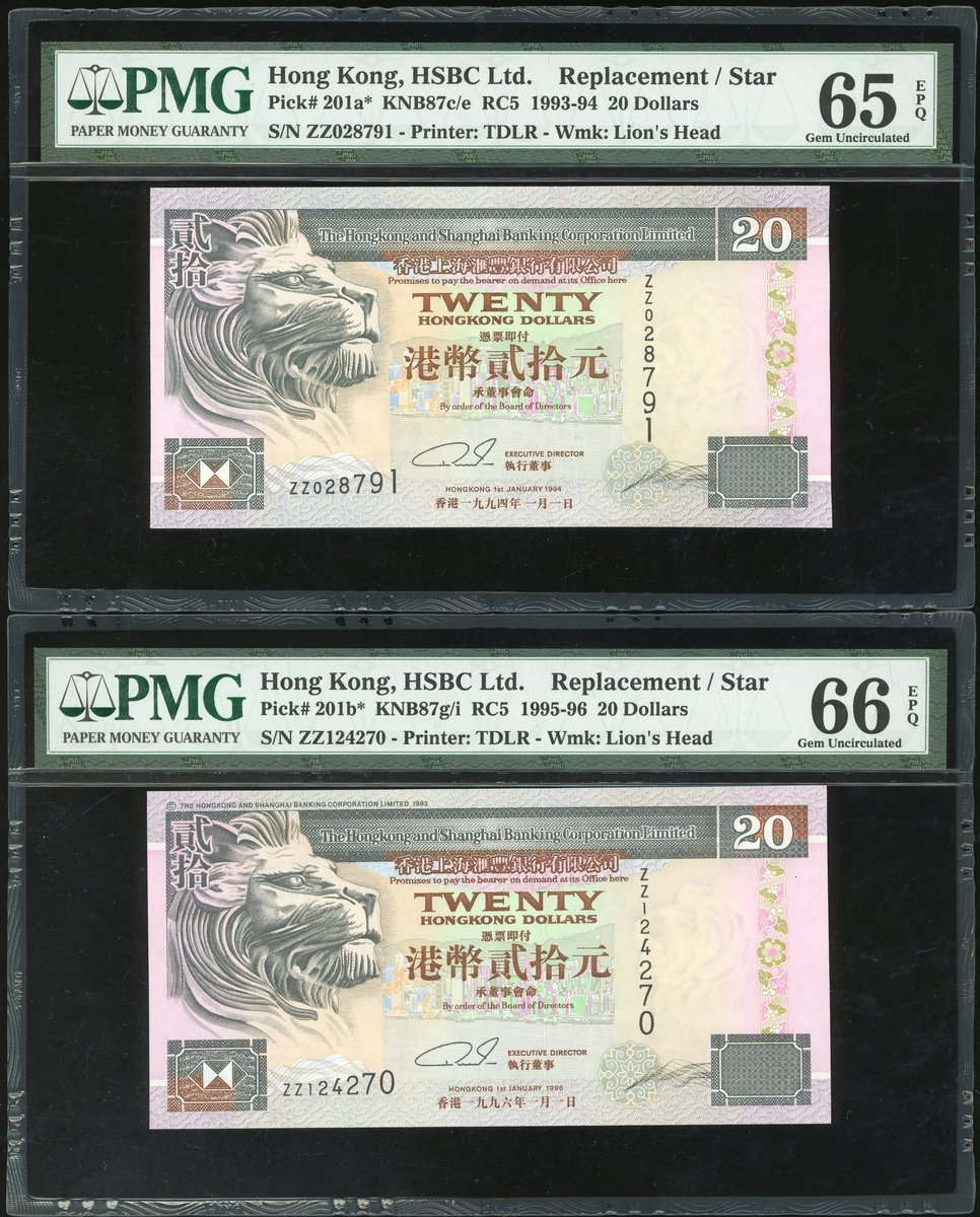 香港補版一組3枚,包括1994及1996年匯豐銀行20元,1994年中國銀行20元,編號ZZ028791,ZZ124270及ZZ000294,分別評PMG 65EPQ,66EPQ及66EPQ