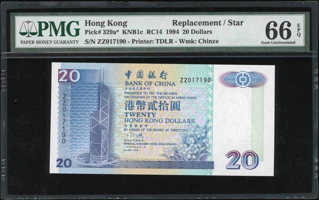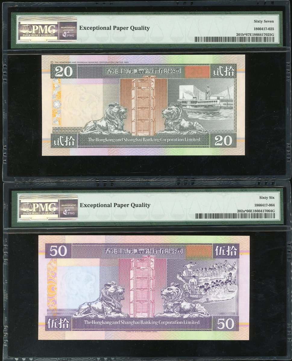 香港補版一組3枚,包括匯豐銀行1996年20元及1994年50元,及1994年中國銀行20元,編號ZZ127428,ZZ042705及ZZ017190,分別評PMG 67EPQ,66EPQ及66EPQ