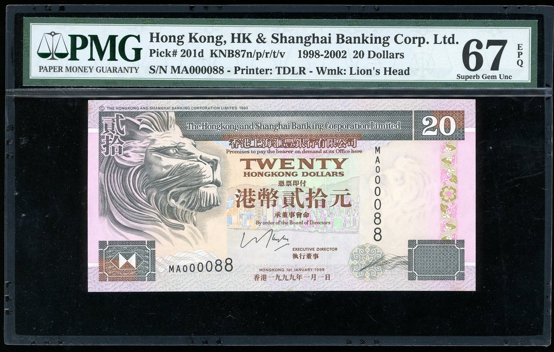 The Hongkong and Shanghai Banking Corporation, $20, 1.1.1999, low serial number MA000088, (Pick 201d), PMG 67EPQ Superb Gem Uncirculated
