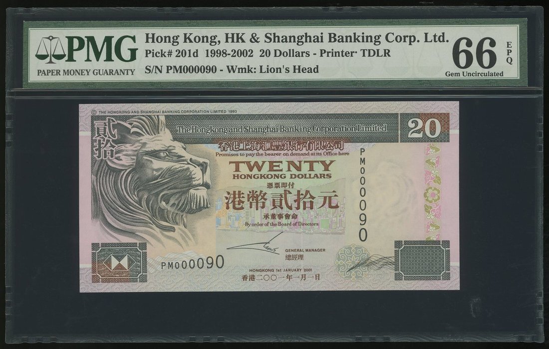 The Hongkong and Shanghai Banking Corporation, $20, 1.1.2001, low serial number PM000090, (Pick 201d), PMG 66EPQ Gem Uncirculated