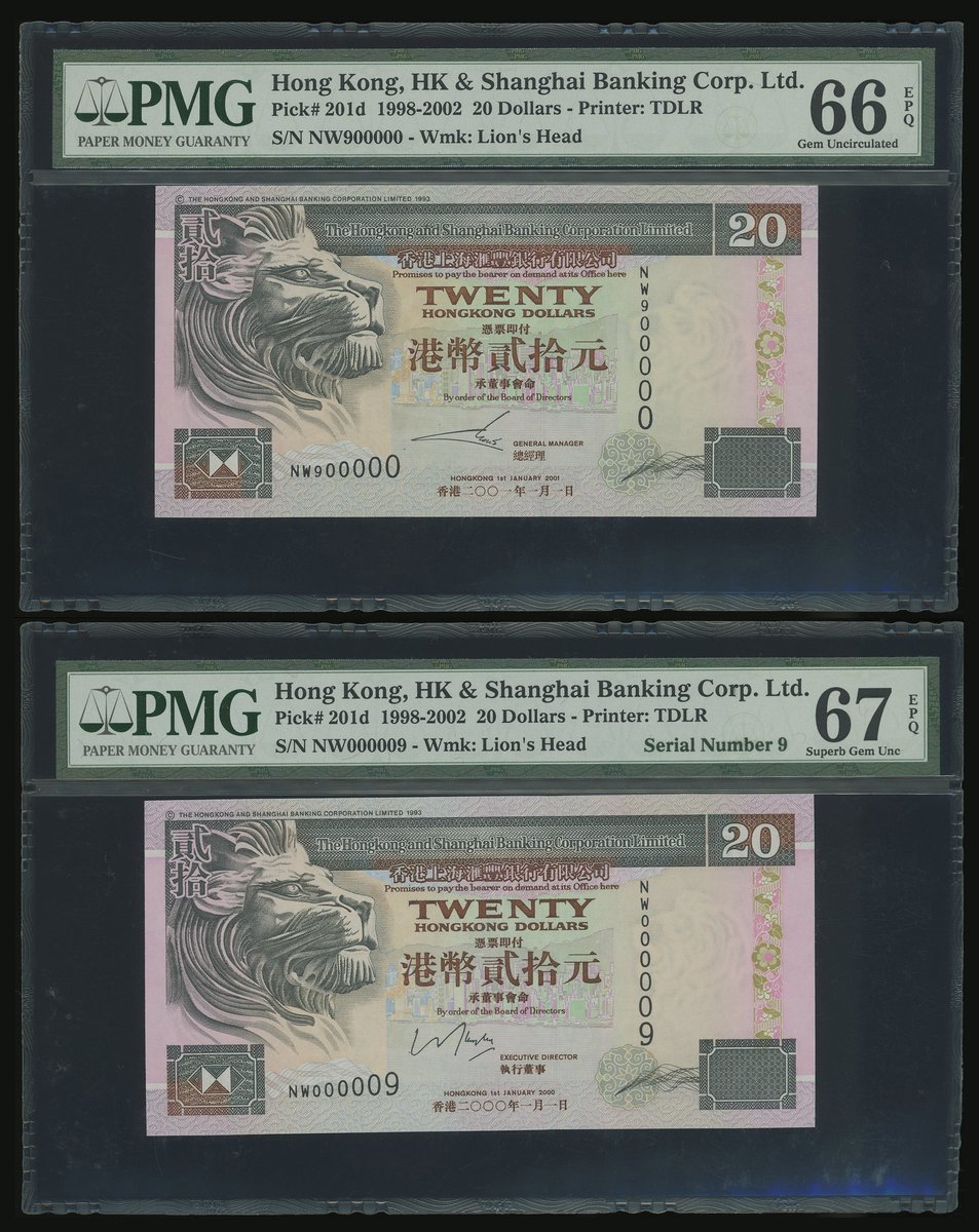2000及01年匯豐銀行20元一對,編號NW000009(細號)及NW900000,分別評PMG 67EPQ及66EPQ,重要年份
