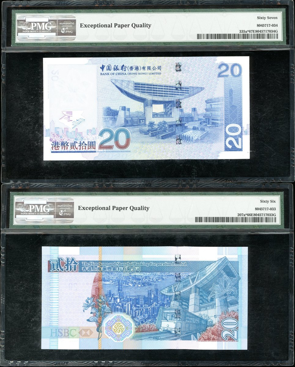 中國銀行及匯豐銀行2003年20元一對,相同補號ZZ048017,分別評PMG 67EPQ及66EPQ