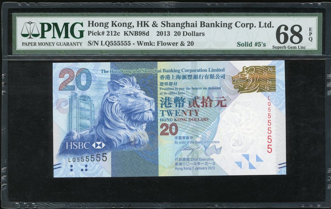 The Hong Kong and Shanghai Banking Corporation, $20, 1.1.2013, solid serial number LQ555555, (Pick 212c), PMG 68EPQ Superb Gem Uncirculated
