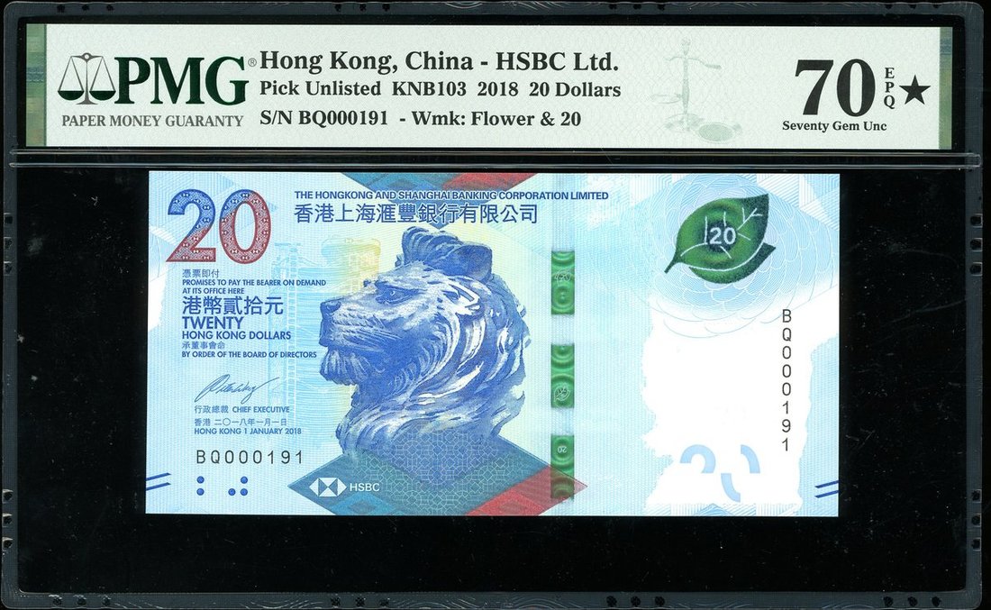 Then HongKong and Shanghai Banking Corporation, $20, 1.1.2018, low serial number BQ000191, PMG 70EPQ* Superb Gem Uncirculated and the highest grade possible!