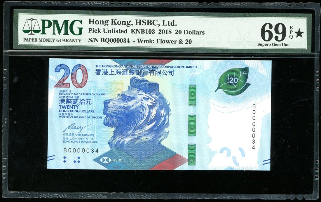 Then HongKong and Shanghai Banking Corporation, $20, 1.1.2018, low serial number BQ000034, PMG 69EPQ* Superb Gem Uncirculated
