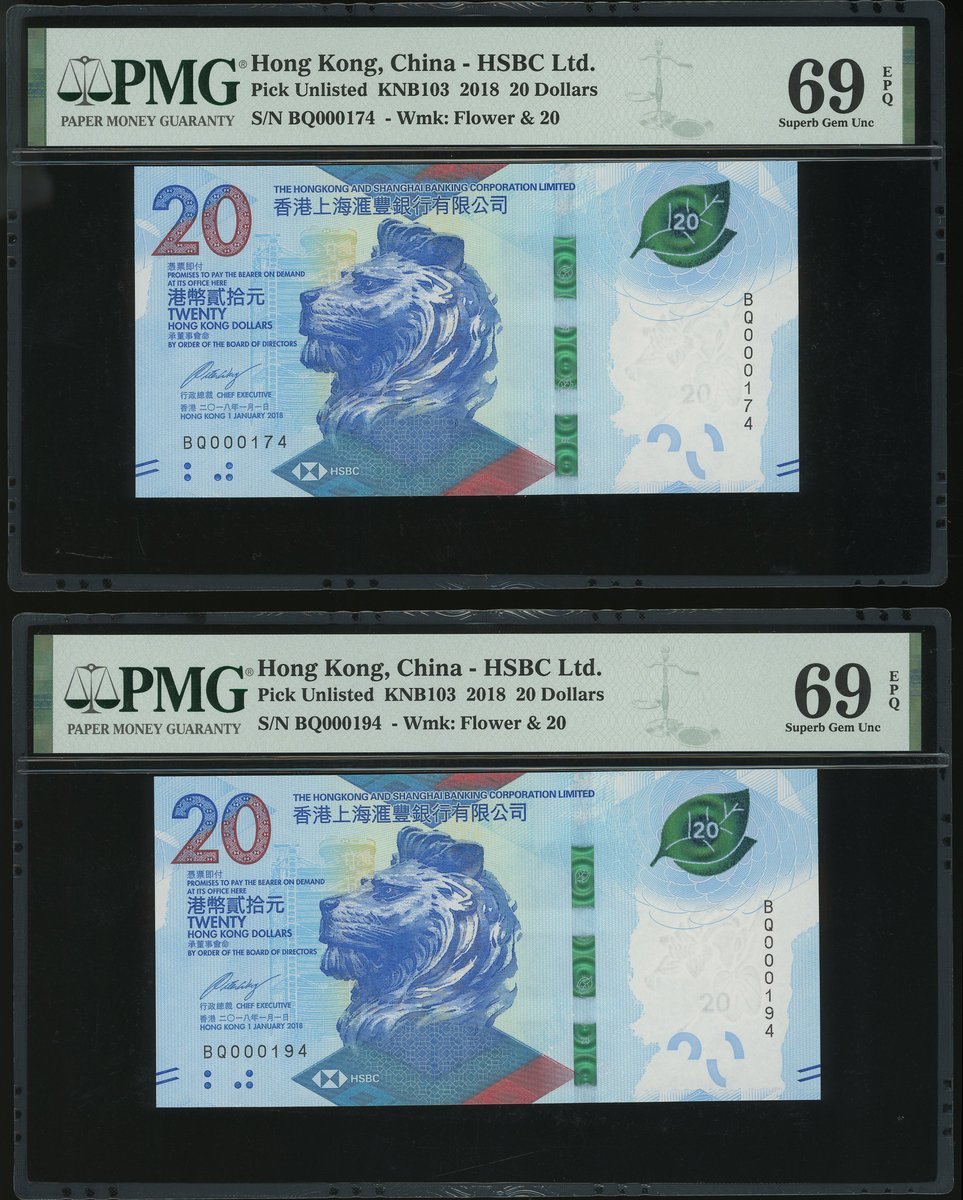 2018年匯豐銀行20元一對,編號BQ000174及BQ000194,均評PMG 69EPQ