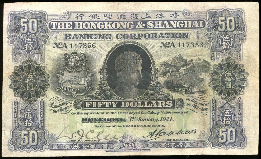 The HongKong and Shanghai Banking Corporation, $50, CONTEMPORARY FORGERY, 1.1.1921, serial number A117356, purple and black on green, bust of Apollo at upper centre,